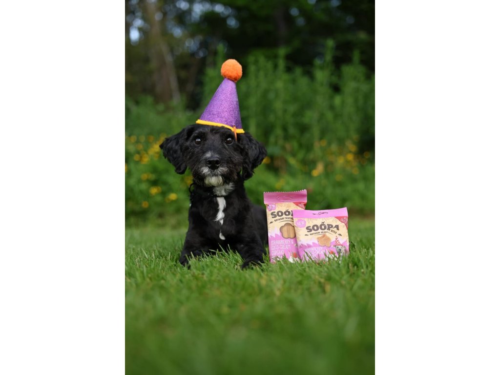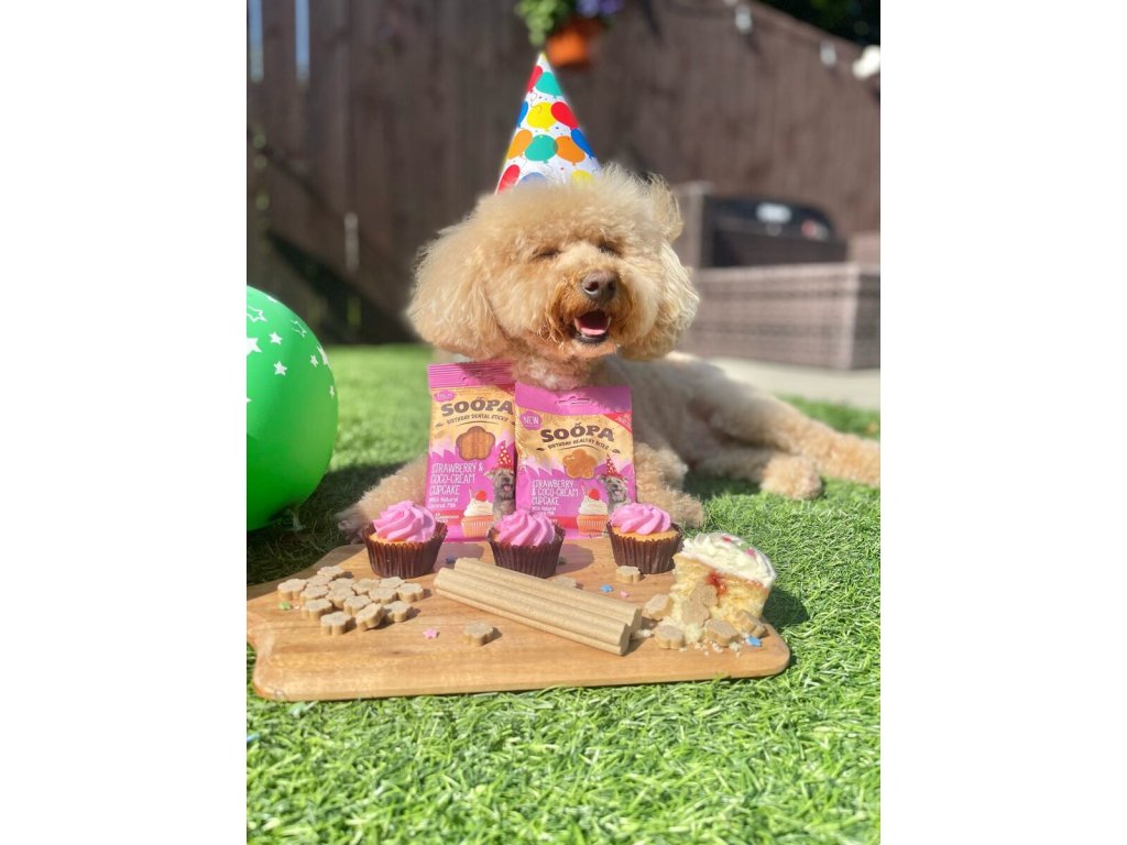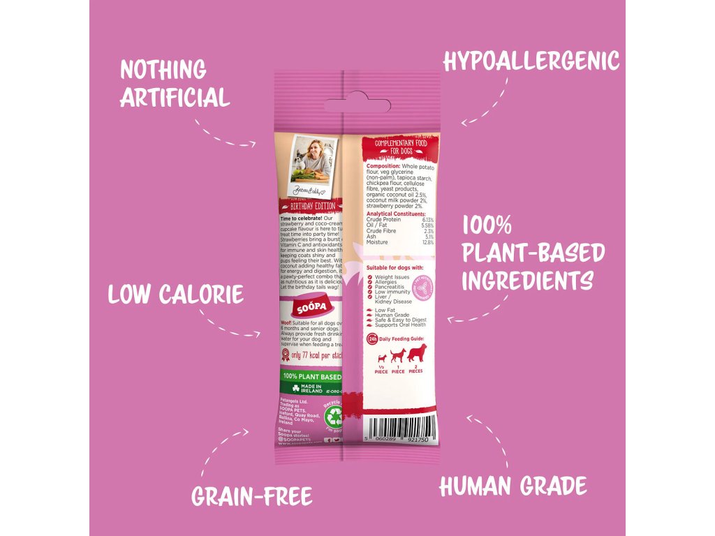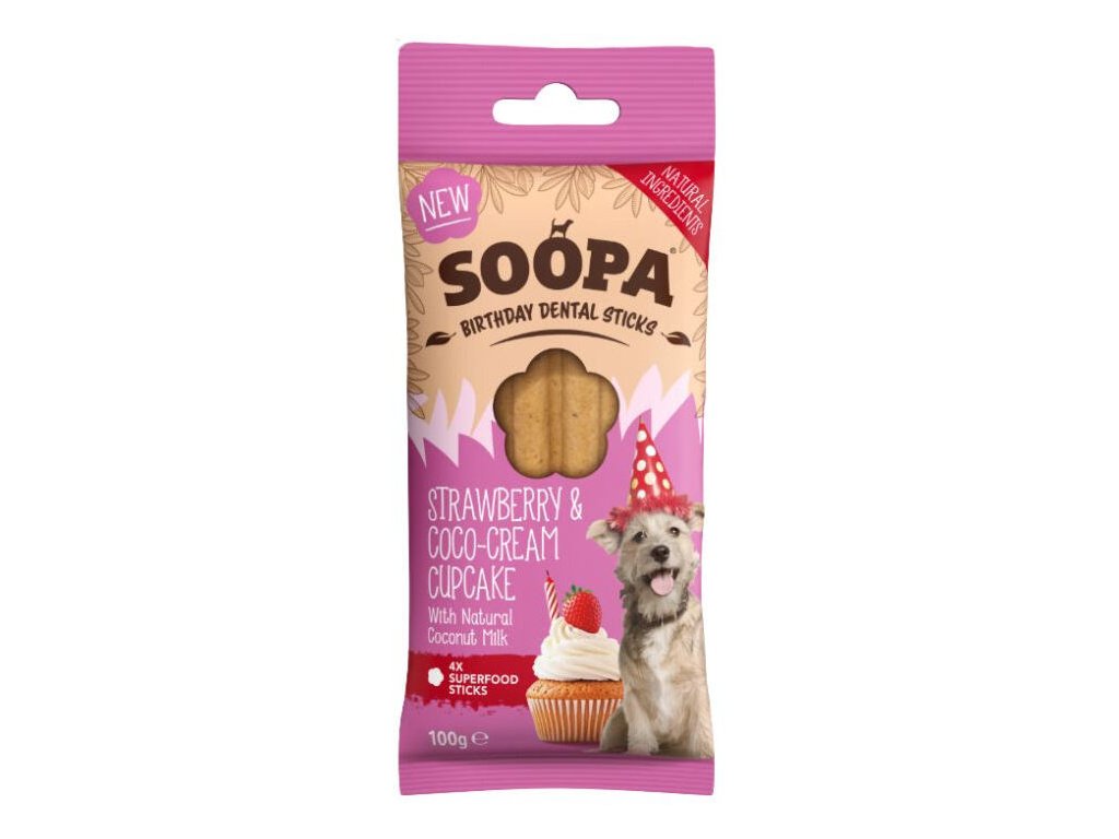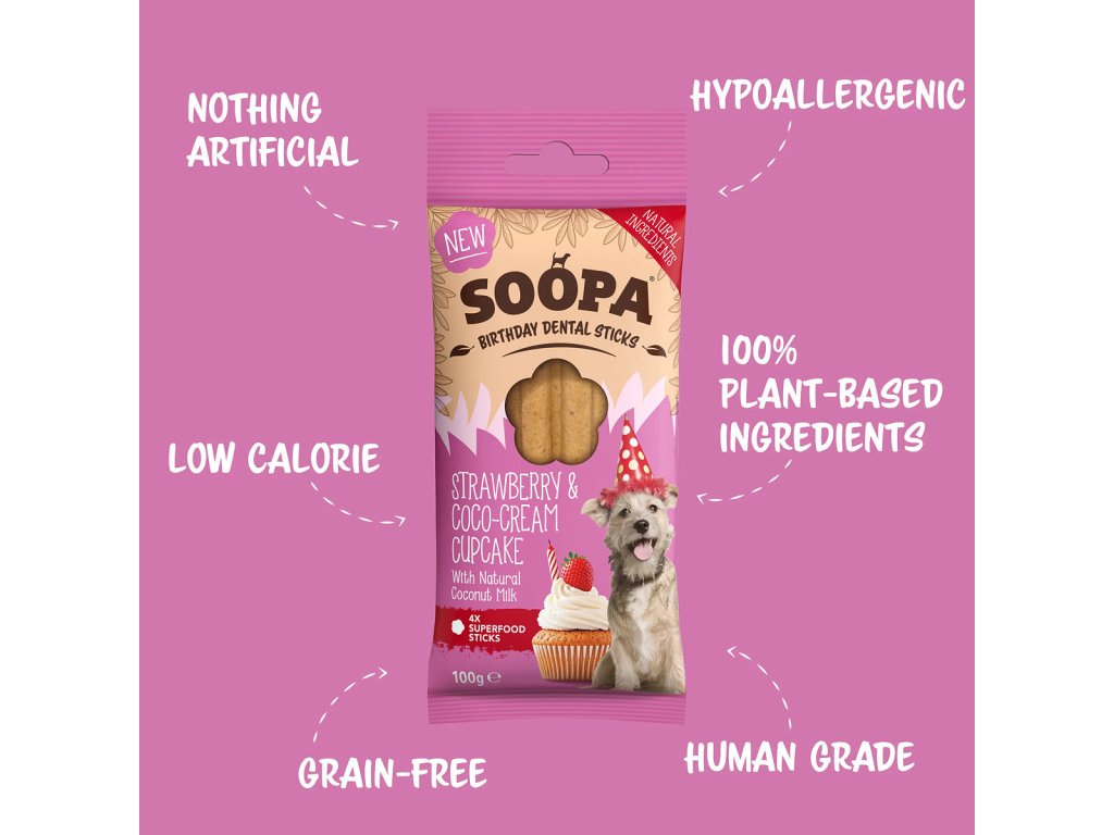 Čas na oslavu! Limitovaná narozeninová edice pamlsků Soopa přináší jedinečnou příchuť jahodovo–kokosového cupcake – ideální dárek pro každého chlupáče, který zrovna slaví narozeniny, nebo jen tak pro radost!Dentální pamlsky Soopa pomáhají čistit zuby, snižovat tvorbu zubního plaku, masírovat dásně a v neposlední řadě pejska skvěle zabaví. Jsou 100% přírodní, veganské, hypoalergenní a bez obilovin, takže potěší i psy s citlivým zažíváním, alergií na živočišné bílkoviny nebo ty, co potřebují dietu s nízkým obsahem proteinu.