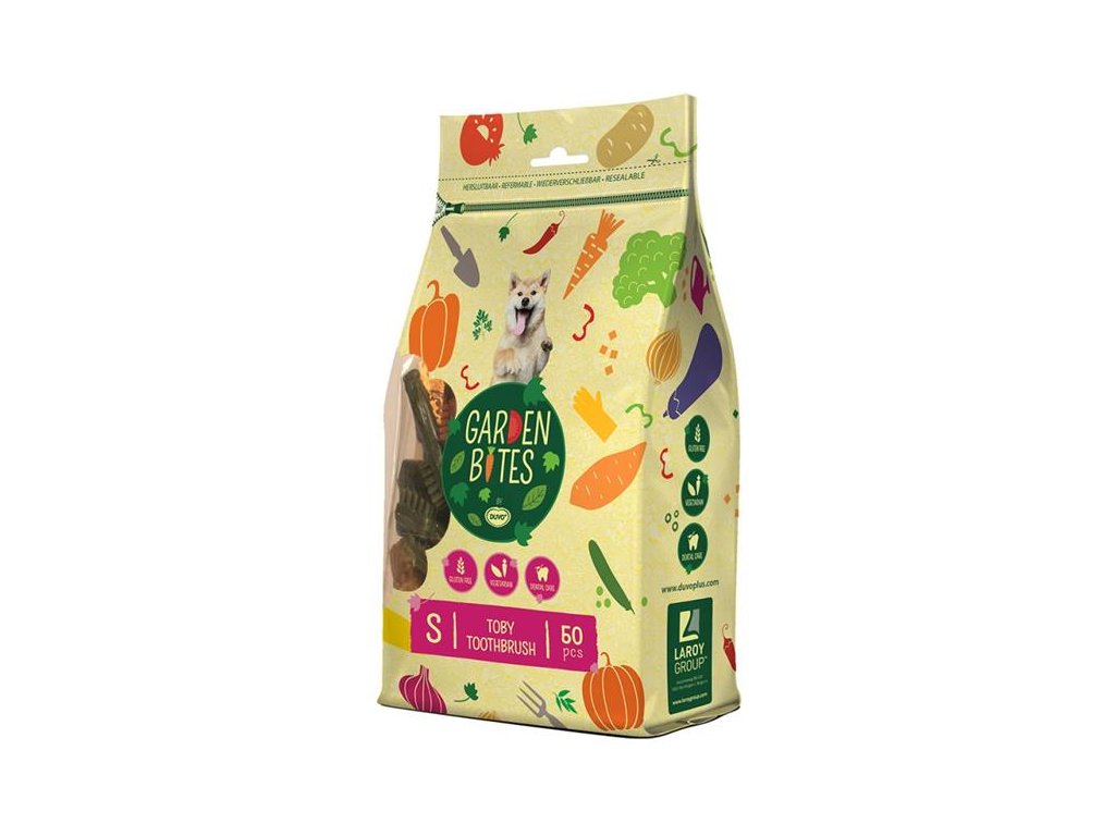 Vegetariánská pochoutka Garden Bites je ideální odměnou pro Vašeho psa. Výborný pamlsek pro psy trpící na alergie, protože tato pochoutka je 100% bez lepku a lehce stravitelná. Díky speciálním tvarům napomáhá pamlsek při čištění a masírování zubů. Přírodní extrakt oleje z máty pak zajišťuje čerstvý dech. Garden Bites obsahuje nejméně 55% sladkých brambor, které jsou skvělým doplňkem stravy Vašeho psa. Sladké brambory jsou bohaté na vápník a železo.