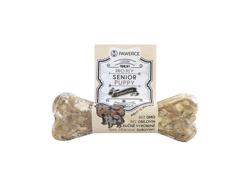 Základ těchto delikátních pamlsků tvoří vysoce kvalitní vnitřní část hovězí kůže vyplněná nádivkou z hovězích drštěk a penisu. Kost Senior je vytvořena speciálně pro starší psy, ale vhodná je také pro štěňata. Je mnohem měkčí než běžné buvolí kosti, stále ještě však podporuje přirozené žvýkací instinkty psů. Zároveň představuje výborný zdroj kolagenu a bílkovin a zdravé žvýkání zabaví vašeho psa na dlouhou dobu.