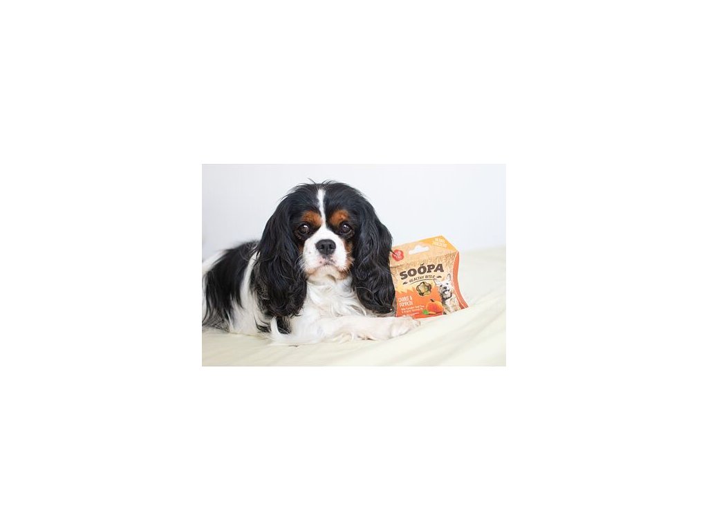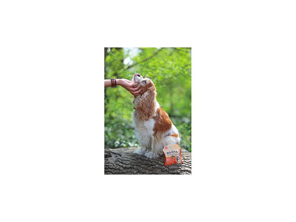 Kousky Soopa jsou veganské 100% přírodní pochoutky, vhodné například na trénink nebo jako zdravá odměna kdykoliv během dne. Díky jejich praktickému kapesnímu balení jsou ideální na cesty.Soopa neobsahují obiloviny, umělá barviva a dochucovadla, jsou nízkotučné, hypoalergenní a vhodné i pro alergické psy, psy s citlivým zažíváním nebo nízkoproteinovou dietou.