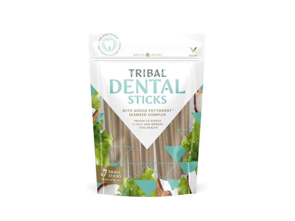 Tribal Dental Sticks Small jsou veganské tyčky s nízkým obsahem tuku vyrobené bez obilovin, přidaného cukru, umělých barviv a konzervačních látek. Jsou určené pro psy všech plemen do 15 kg a od 6 měsíců věku a jsou vhodné i pro psy s onemocněním štítné žlázy.
