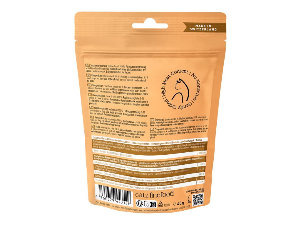 Křupavé proužky kuřecího masa jsou dokonalým doplňkem k vysoce kvalitnímu sortimentu mokrého krmiva Catz finefood.Kuřecího maso pochází ze Švýcarska od místních ekologických farmářů a producentů, kteří kuřata chovají podle zásad trvale udržitelného rozvoje.