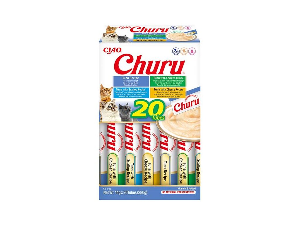 Výběr krémových pamlsků Churu ve variaci s tuňákem. Balení obsahuje celkem 20 pamlsků: 5x tuňáková receptura, 5x tuňák s kuřetem, 5x tuňák s hřebenatkou a 5x tuňák se sýrem. Zdravé mlsání s nízkým obsahem kalorií, bez konzervantů, chemických aromat, bez barviv a umělých dochucovadel. Inovativní měkká konzistence pamlsku Churu vám umožní trávit společné chvíle s vaší kočičkou hravým a interaktivním způsobem. Kočičí pamlsky Churu mají vysoký obsah vody a díky tomu jsou vhodným doplňkem k suchému krmivu nebo pro kočky, které málo pijí. Pamlsky Churu jsou 100 % přírodní a zdravé mlsání pro kočičky všech věkových kategorií. Churu jsou ideální pro ukrytí tablety na odčervení či jiného léku, který je potřeba kočce nenásilně podat.