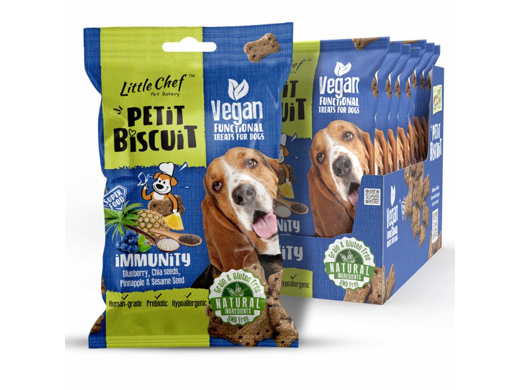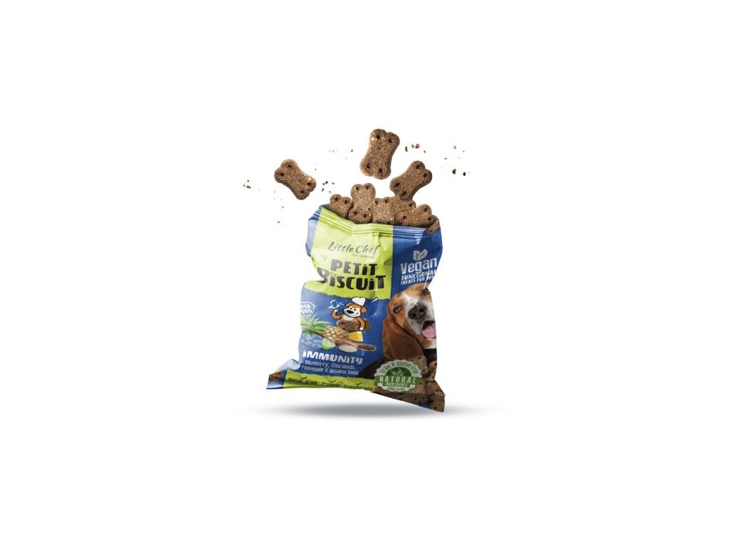 Petit Biscuit Immunity jsou funkční pamlsky pečené v malých dávkách z veganských surovin v potravinářské kvalitě. Jejich receptura s borůvkovou a ananasovou dření, chia semínky a sezamem byla navržena tak, aby přirozeně podpořila imunitní systém, celkovou vitalitu a odolnost organismu.Pamlsky obsahují pouze přírodní veganské suroviny – žádné obiloviny, maso ani umělé přísady. Cizrna, bramborová mouka a banánová dřeň dodávají energii, vlákninu a důležité živiny. Borůvky jsou bohaté na antioxidanty, které posilují obranyschopnost a chrání buňky před oxidačním stresem. Chia a lněná semínka přispívají k imunitě i zdraví kůže a srsti díky obsahu omega-3 mastných kyselin. Sezamové semínko dodává důležité minerály jako je vápník, zinek a hořčík. Ananasová dřeň obsahuje enzymy, které napomáhají trávení a vstřebávání živin. Kořen lékořice má protizánětlivé účinky a pozitivně ovlivňuje imunitní i trávicí systém. Inulin a pivovarské kvasnice působí jako prebiotika – podporují růst prospěšných bakterií ve střevech a tím i celkovou rovnováhu v organismu. Pamlsky jsou dochucené rozmarýnovým extraktem, který působí jako přírodní antioxidant.