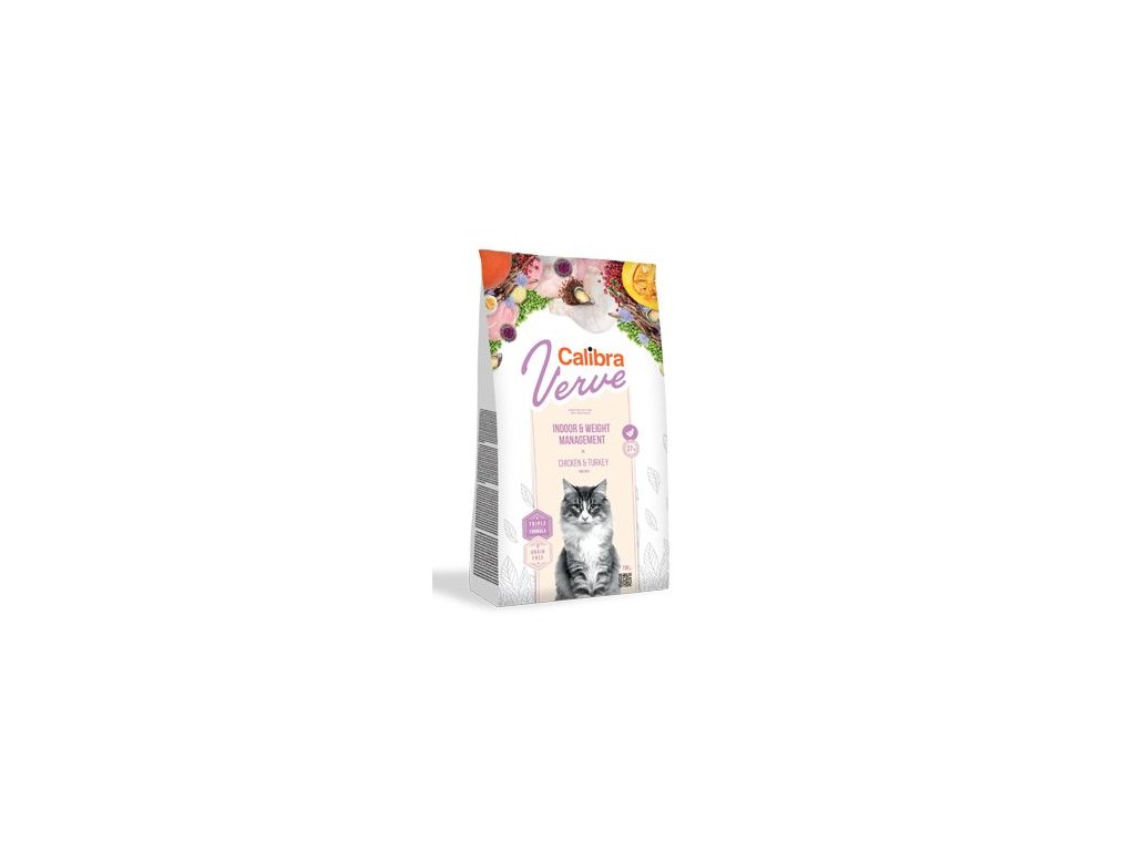 Calibra Cat Verve Indoor + Weight Management Chicken & Turkey je kompletní krmivo bez obilovin s vysokým obsahem čerstvého masa – s kuřetem a krůtou. Receptura je určená pro kočky žijící v domácnosti a také pro ty, které potřebují ohlídat váhu.Čerstvé maso z kuřete tvoří 27 % celkového obsahu. Proteiny v receptuře jsou z 80,8 % živočišného původu. Krmivo tak představuje vysoce výživnou a zároveň přirozeně vyváženou porci, která je pro kočku jako masožravce zároveň lehce stravitelná. Křupavá a nadýchaná konzistence granulí je neodolatelným lákadlem.