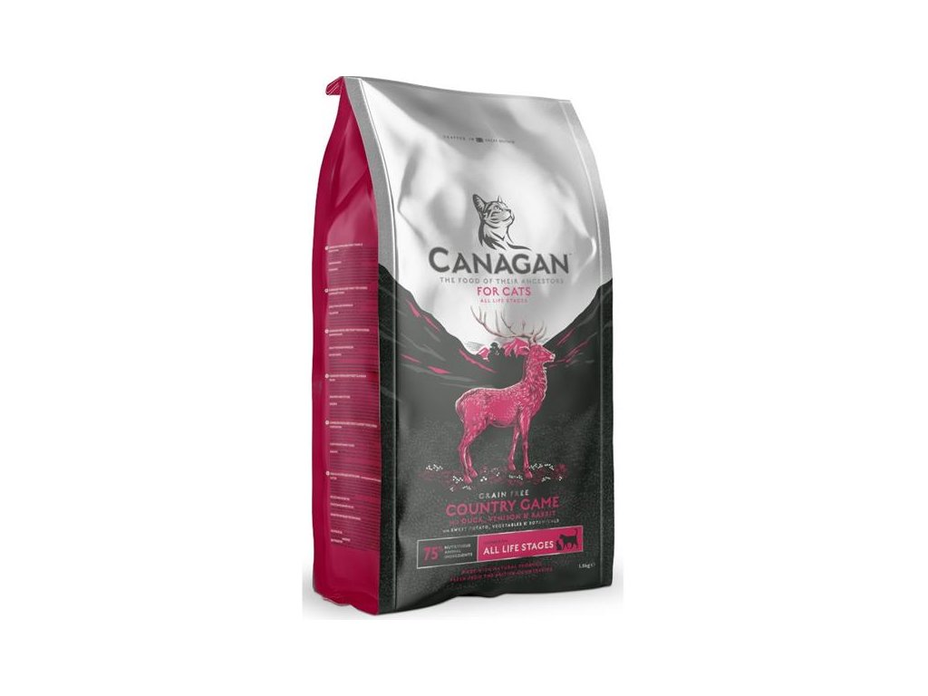 Kompletní krmivo Canagan Country Game (zvěřina) je vyráběno zcela bez obilovin pro kočky všech věkových kategorií tak, aby se co nejvíce blížilo stravě kočičích předků, tedy s ideálním poměrem bílkovin, tuků i sacharidů. Čerstvě připravené kachní maso i zvěřinu používá Canagan pouze v kvalitě pro lidskou spotřebu. Živočišné suroviny jsou perfektně doplněny mnoha druhy zeleniny a bylin. Společně tak dodávají receptuře Country Game jedinečnou chuť.