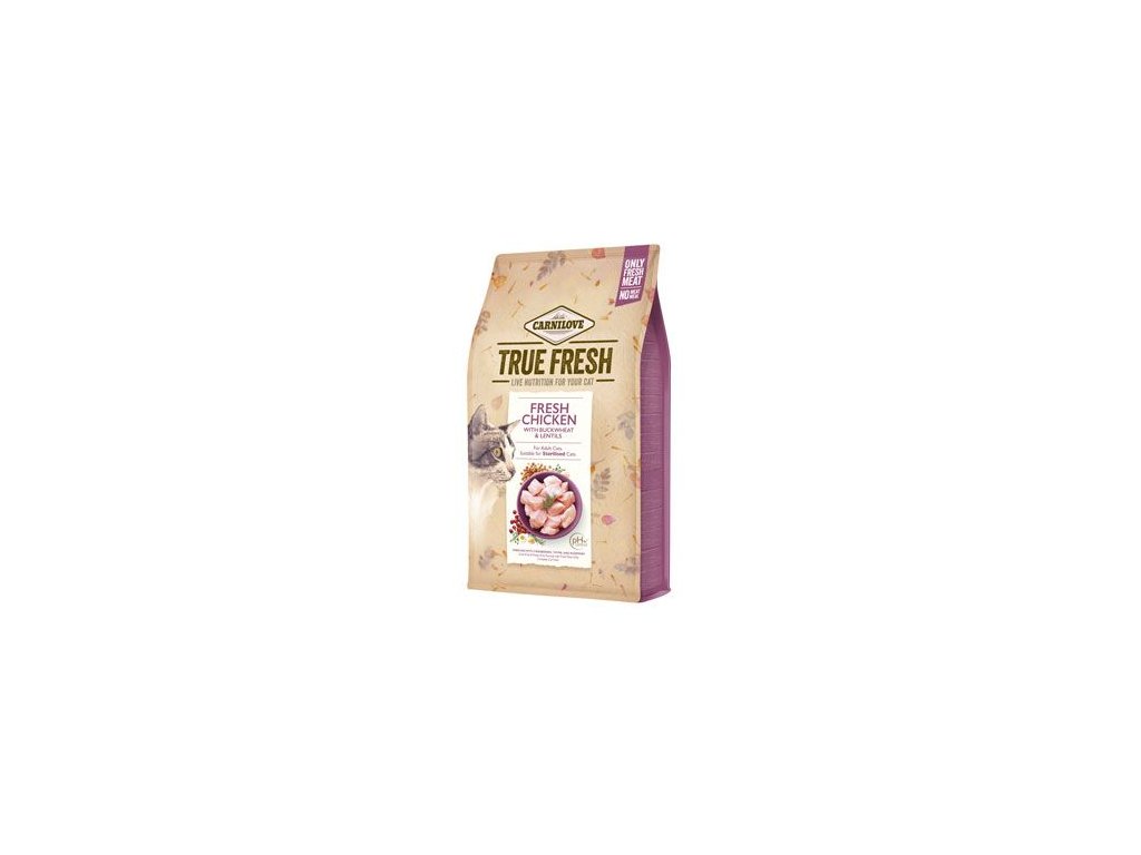 CARNILOVE TRUE FRESH CHICKEN. Receptura bez obilovin a brambor pouze s čerstvým masem pro dospělé kočky. Vhodné pro kastrované kočky. Kompletní krmivo pro kočky.