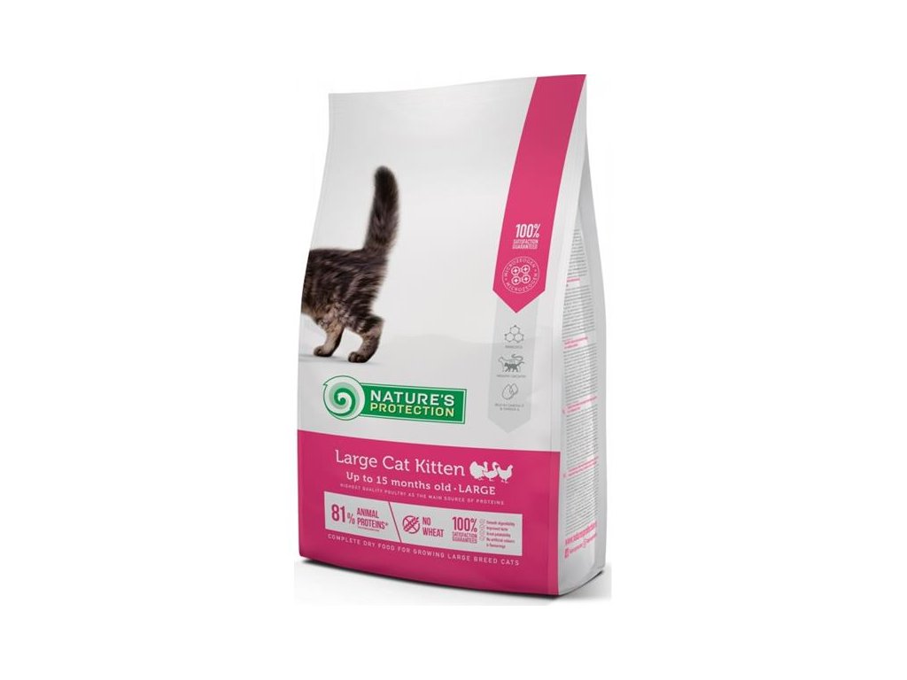 Nature's Protection Large Cat Kitten jsou speciální výživově kompletní granule pro koťata velkých plemen (mainská mývalí kočka, norská lesní kočka, americký bobtail, savanová kočka, sibiřská kočka, turecká van, ragdoll atd.) do 15 měsíců věku. Vývin velkých koček trvá déle a maximální velikosti dosahují až ve věku 3–4 let. Tato receptura je připravena speciálně pro koťata těchto plemen, kterým pomáhá zajistit správný vývoj kloubů a svalů. Větší granulky vyhovují jejich větším čelistem, brání příliš uspěchanému příjmu potravy a podporují správné žvýkání.