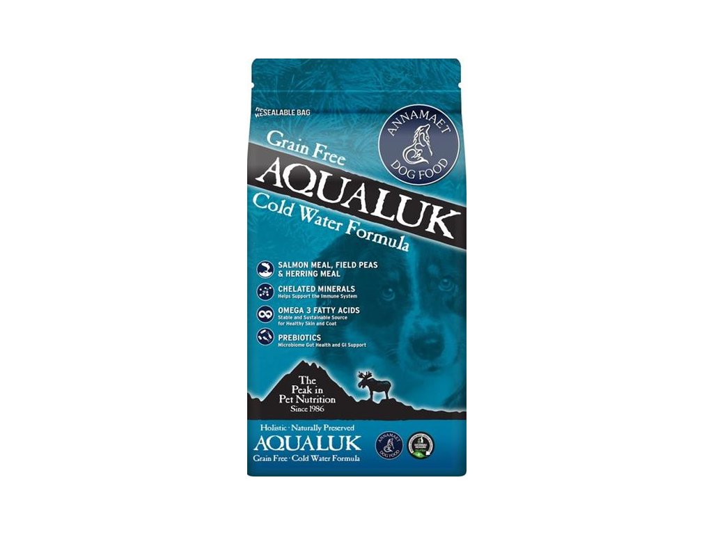 Annamaet Grain Free AQUALUK, receptura „z chladných vod“, obsahuje živočišné bílkoviny z divokých tichomořských lososů a sleďů. Je bohatým zdrojem omega-3 mastných kyselin a skvělým krmivem pro psy s citlivou kůží a trávicími obtížemi.