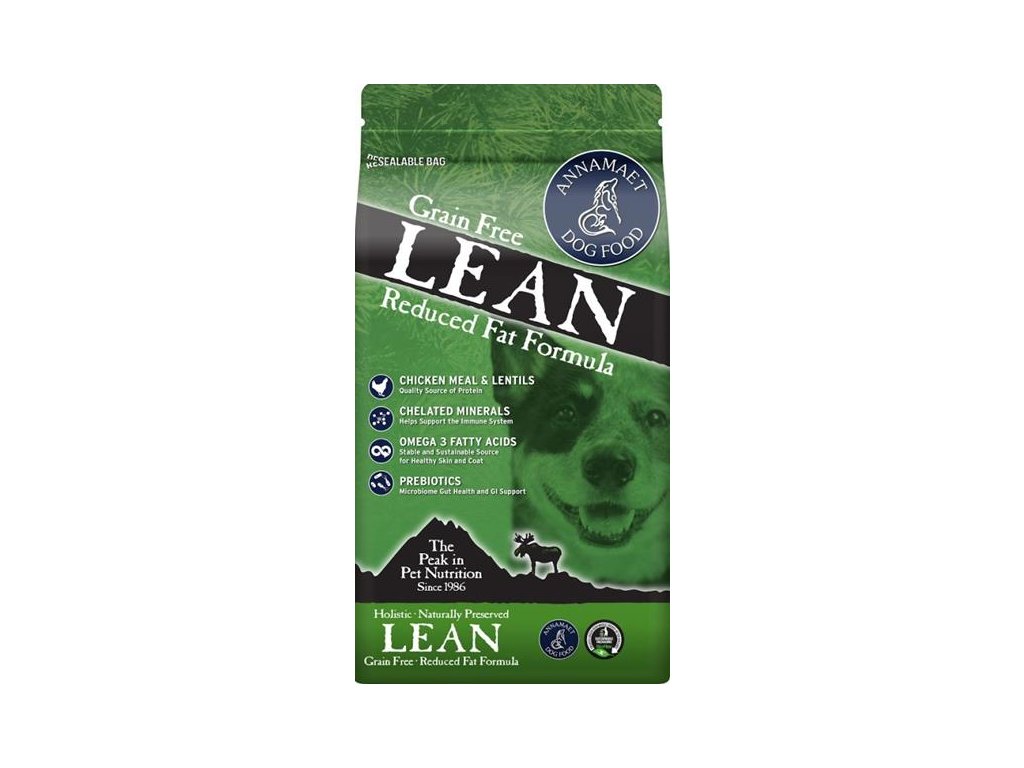 Krmivo Annamaet Grain Free LEAN s nižším obsahem tuků (8 %) je ideální pro snižování a udržování tělesné hmotnosti a vhodné pro psy s pankreatitidou. Vysoký obsah proteinů (30 %) zajišťuje krmivu sytost a pomáhá udržovat svalovou hmotu bez tvorby tukových zásob. Hlavními zdroji bílkovin v této receptuře jsou kuře, kachna a sleď. Veškerá drůbež pochází z ekologických chovů nepoužívajících antibiotika ani hormony.