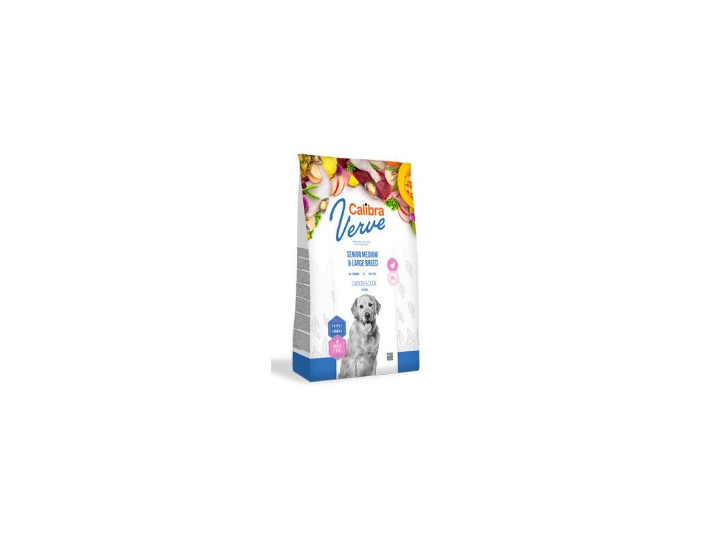 Calibra Dog Verve Senior Medium & Large Breed (Chicken & Duck) je kompletní suché krmivo s čerstvým masem a bez obilovin. Receptura je určená pro dospělé psy nad 6 let středních a velkých plemen o hmotnosti 10–90 kg. S obsahem 30 % čerstvého kuřecího masa v kombinaci s luxusním kachním proteinem je krmivo, které odpovídá nejvyšším požadavkům na přirozené stravování psa, v souladu s jeho fyziologickými potřebami. Adekvátní výživa pro zralého psa je doplněna o zvýšené množství chondroprotektivních látek pro namáhané klouby větších pejsků.Čerstvé maso je vysoce výživným zdrojem bílkovin, který se vyznačuje atraktivní chut,í a je vhodné i pro citlivé zažívání.