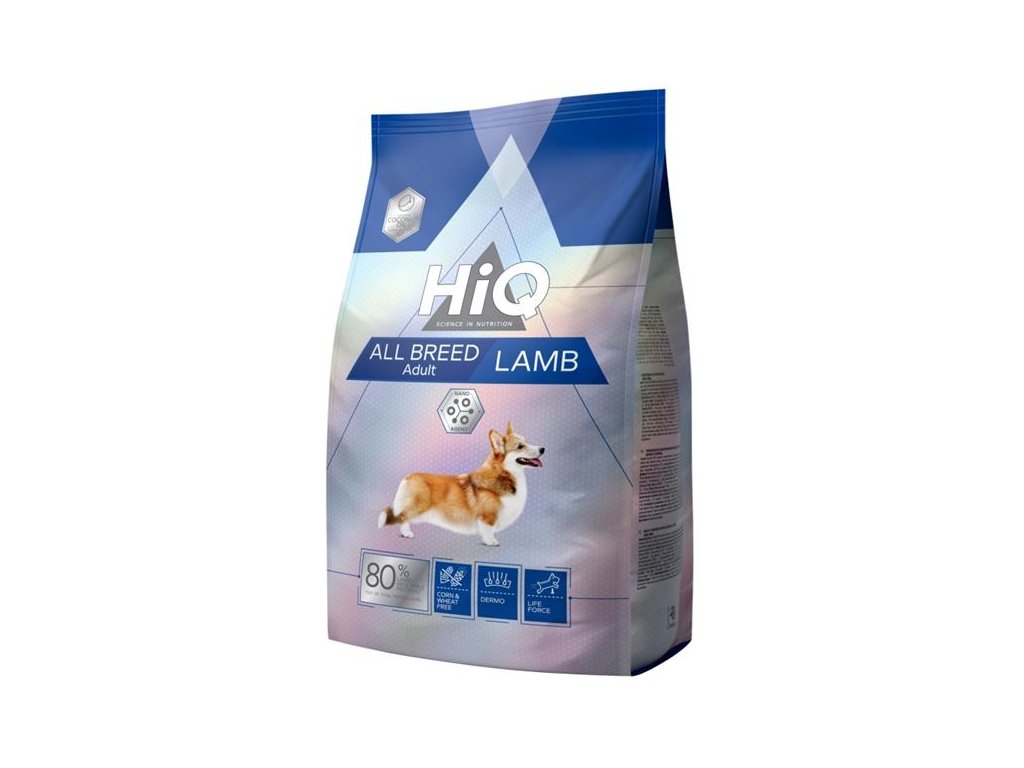 Kompletní krmivo HiQ pro dospělé psy všech plemen obsahuje bílkoviny z jehněčího masa, které vyhovují potřebám organismu a udržují správnou energetickou rovnováhu. Neobsahuje pšenici a kukuřici, proto je vhodné pro psy s citlivým zažíváním nebo trpící nesnášenlivostí lepku. Krmivo podporuje snadné trávení a vstřebávání živin. Komponenty krmiva napomáhají zachovat lesk a hustotu srsti a také podporují zdraví pokožky. Zároveň podporují udržení optimální hmotnosti psa.