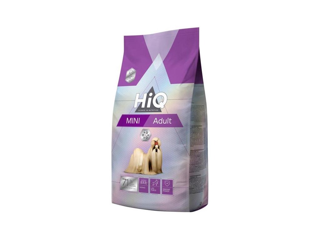 Kompletní krmivo HiQ Adult Mini pro dospělé psy malých plemen o hmotnosti 1–10 kg obsahuje jako hlavní složku drůbeží maso – zdroj nejsnáze stravitelných živočišných bílkovin ideální pro udržení správného svalového tonu. Komponenty krmiva podporují zdraví pokožky a napomáhají k lesklé a husté srsti. Granule podporují trávení a vstřebávání živin a poskytují dostatek energie pro vitalitu psa.