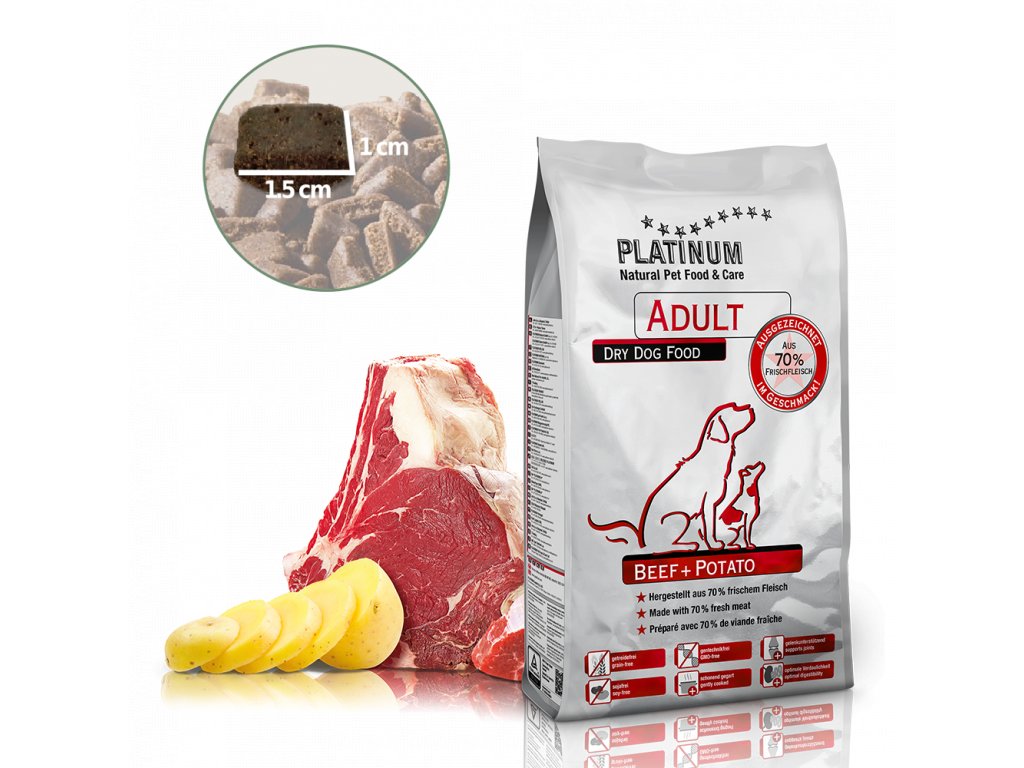 PLATINUM BEEF + POTATO je superprémiové hypoalergenní krmivo s nulovým obsahem zrnin (obilovin) pro dospělé psy všech plemen. Díky svému přírodnímu, jednoduchému složení je snadno stravitelné. Vyhovuje nutričním požadavkům psů s citlivým zažíváním a problematickou střevní mikroflórou. Zvyšuje imunitu a definitivně řeší různé potravinové intolerance. Je vhodné i pro aktivní starší psy. PLATINUM BEEF + POTATO je absolutní špičkou mezi krmivy s označením GRAIN FREE, protože skutečně každá složka tohoto krmiva má pro psa svůj nezaměnitelný dietologický význam.