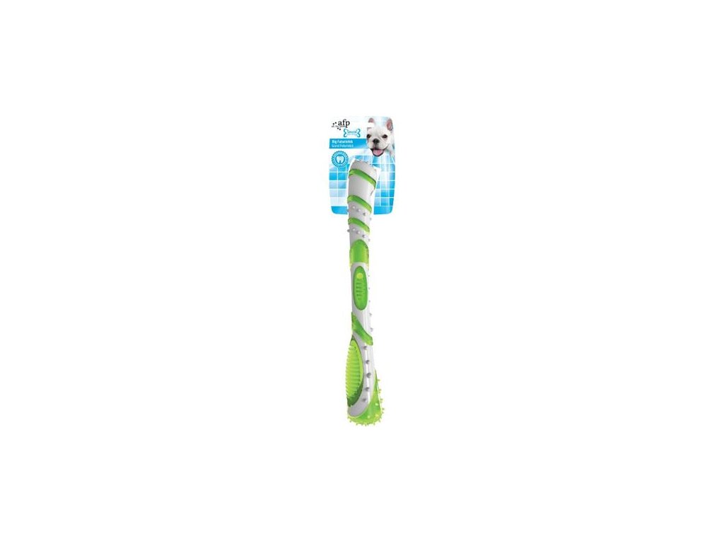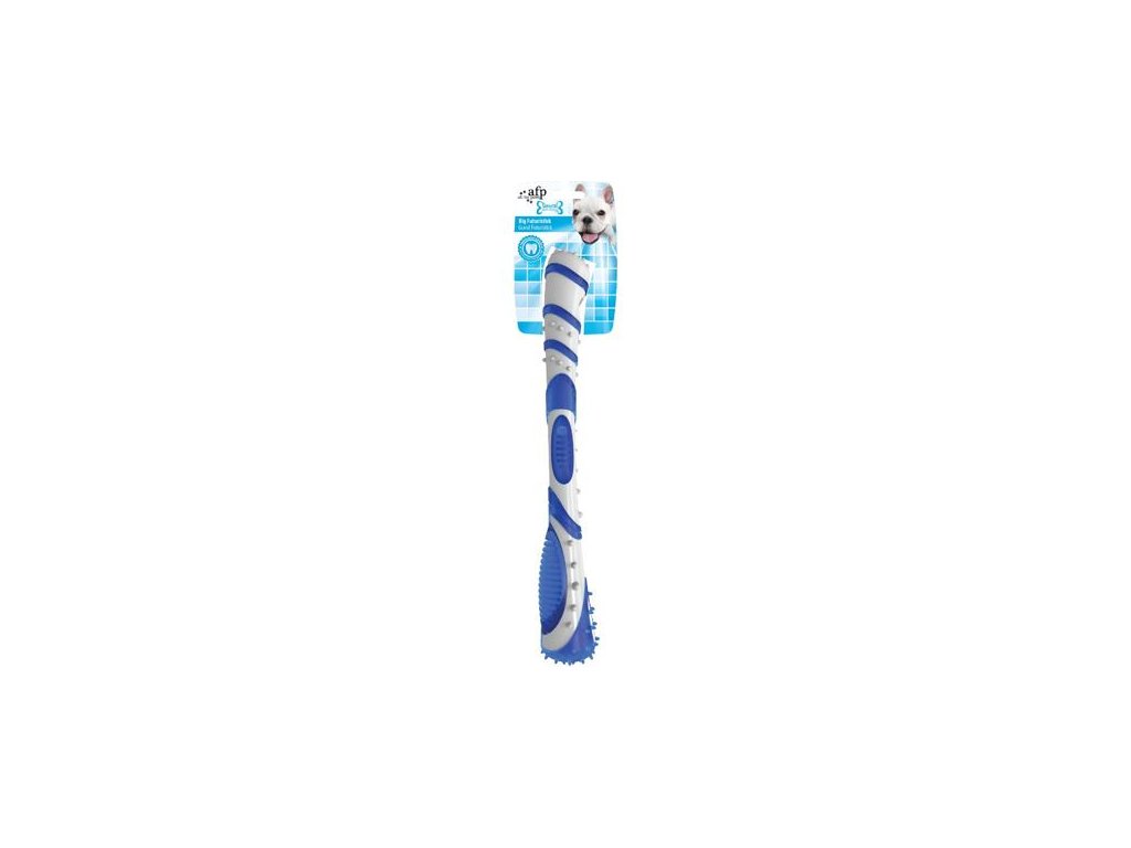 Žvýkací hračka v ergonomickém tvaru zaoblené tyče se speciálními rýhami a výstupky, umožňuje snadnější uchopení, láká ke kousání a žvýkaní, a tím pomáhá udržovat čisté dásně a zuby.Tyč je vyrobena z kombinace tvrdšího a jemnějšího nylonu a plastu pokrytého gumou.