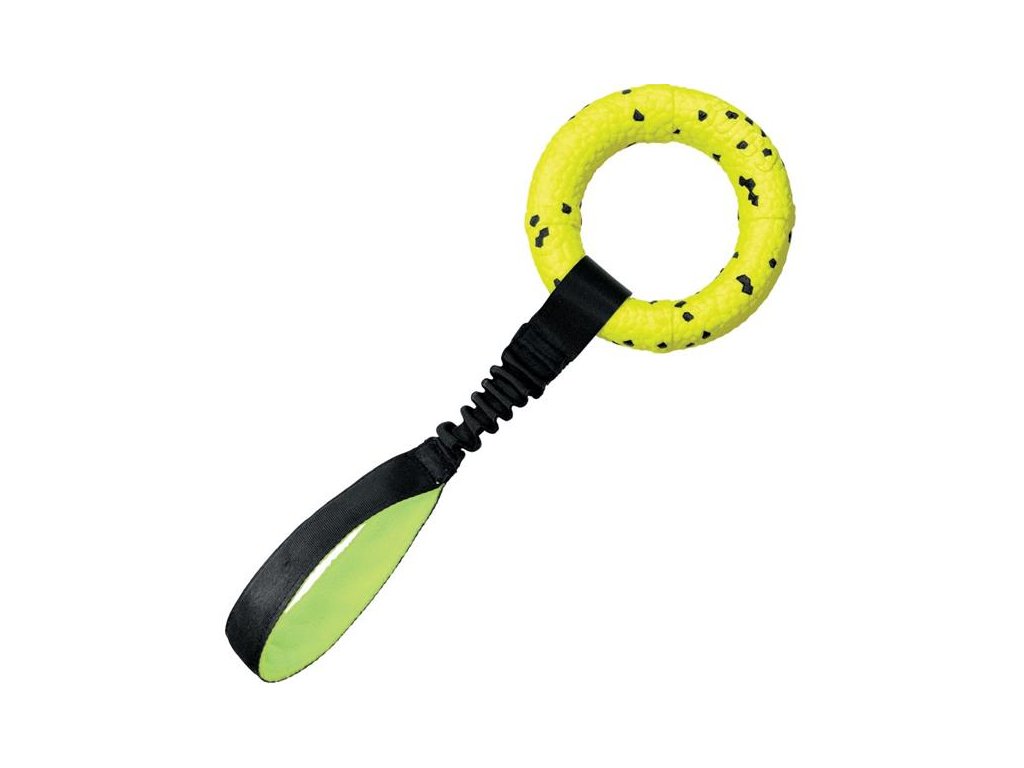 - kvalitní materiály – kruh z pěnové gumy odolávající psím zubům a tahu, elastický popruh a pohodlná rukojeť (ucho) pro majitele;