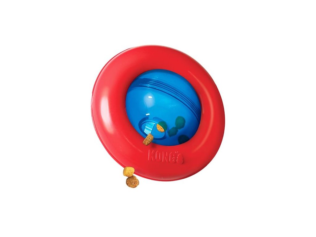 Interaktivní, plnitelná hračka KONG Gyro míč je zároveň hlavolam a zpomalovací miska. Plnitelný míč můžete využít jako aportovací míč, nebo jako interaktivní hádanku pro Vašeho psa. Naplňte míč granulemi či pamlsky a tím začne zábavné a pomalé krmení.