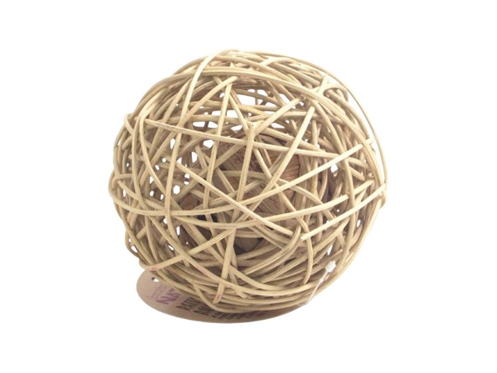 Pletená ratanová koule, uvnitř s kuličkou z listů vodního hyacintu. Hračka pro drobné savce, která zahání nudu a podporuje hlodání, vyrobená ze 100% přírodních materiálů bez použití lepidel, drátů a svorek.