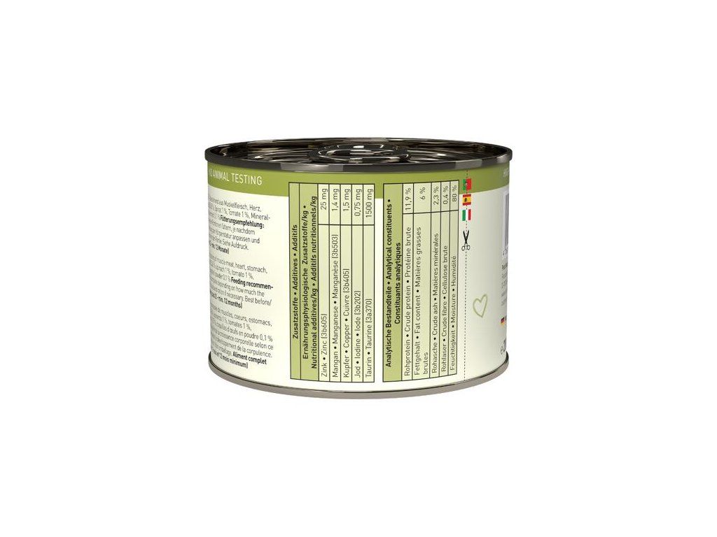 Stejně jako všechna krmiva Catz finefood, tato konzerva neobsahuje geneticky upravené suroviny, je bez konzervantů, umělých barviv a dochucovadel. Všechny použité suroviny svým složením odpovídají přirozené kočičí stravě.
