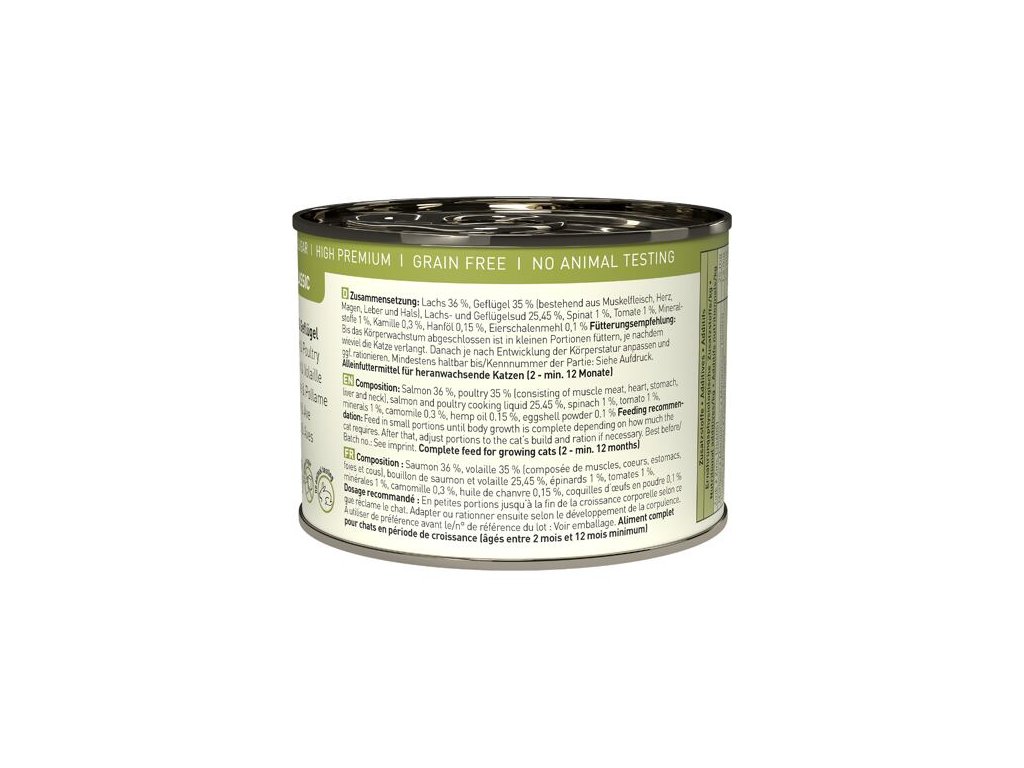 Složení: losos 36%, drůbeží maso 35 % (svalovina, srdce, žaludek, játra a krk), vývar z lososa a drůbeže 25,45%, špenát 1%, rajče 1%, minerální látky 1%, heřmánek 0,3%, konopný olej 0,15 %, vaječné skořápky 0,1%,