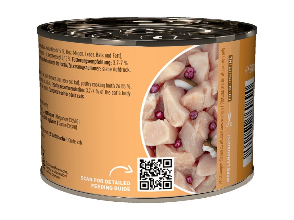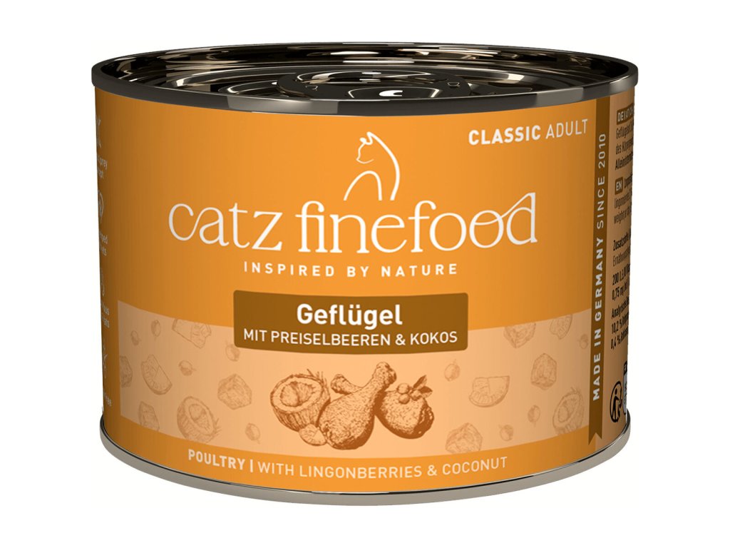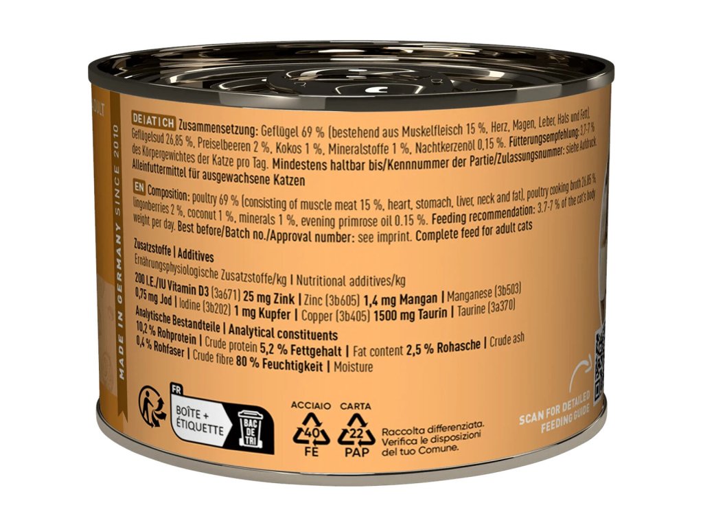 Kompletní krmivo pro kočky, které obsahuje chutné drůbeží maso a vývar, brusinky, kokos a pupalkový olej – suroviny vysoké potravinářské kvality, které odpovídají přirozené kočičí stravě. Bez konzervantů, umělých barviv, dochucovadel a geneticky upravených surovin.Složení: drůbež 69 % (z toho svalovina 15 %, srdce, žaludek, játra, krk a tuk), drůbeží vývar 26,85 %, brusinky 2 %, kokos 1 %, minerální látky 1 %, pupalkový olej 0,15 %