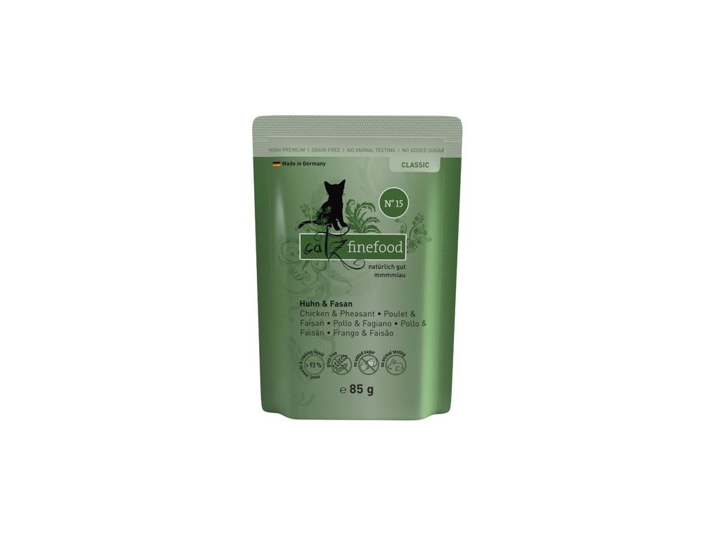 Lahodná kapsička pro kočky, která obsahuje vysoký podíl kuřecího a bažantího masa, zdraví prospěšnou řeřichu a smetánku lékařskou. Konzervy Catz finefood obsahují pouze suroviny vysoké potravinářské kvality a svým složením odpovídají přirozené kočičí stravě. Jsou bez konzervantů, umělých barviv a dochucovadel. Konzervy neobsahují geneticky upravené suroviny. Jedná se o kompletní krmivo.Složení: kuřecí maso 50% (srdce, svalovina, játra, žaludek, krk a tuk), kuřecí a bažantí vývar 23,3 %, bažantí maso 20%, quinoa 3%, řeřicha 2%, minerály 1%, smetánka lékařská 0,5%, pupalkový olej 0,2%