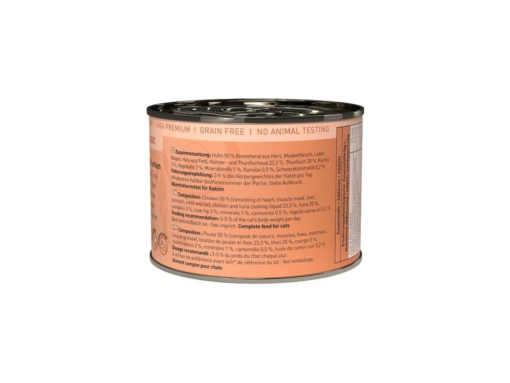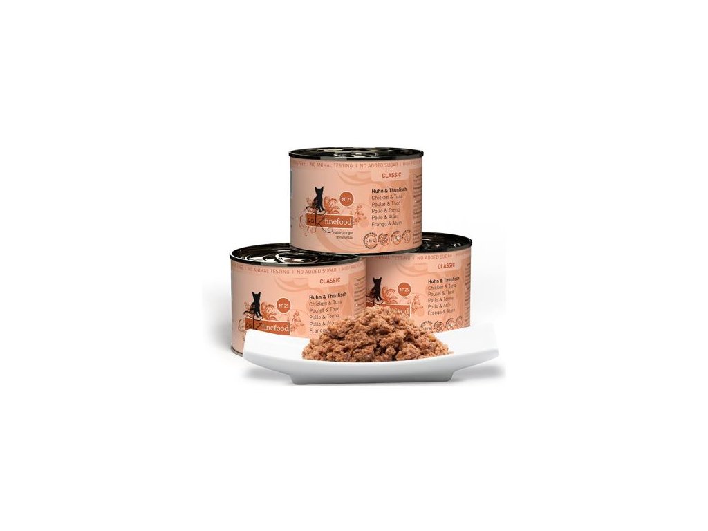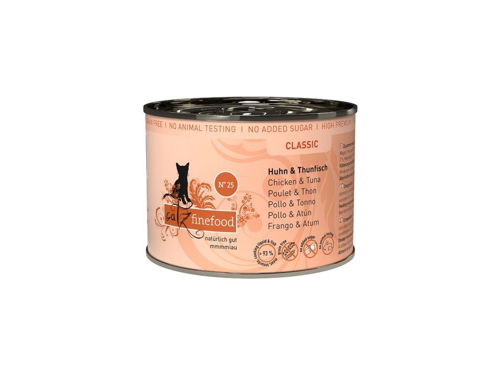 Lahodná konzerva pro kočky, která obsahuje vysoký podíl kuřecího masa a tuňáka, zdraví prospěšné šípky a heřmánek. Konzervy Catz finefood obsahují pouze suroviny vysoké potravinářské kvality a svým složením odpovídají přirozené kočičí stravě. Jsou bez konzervantů, umělých barviv a dochucovadel. Konzervy neobsahují geneticky upravené suroviny. Jedná se o kompletní krmivo.Složení: kuřecí maso 50% (srdce, svalovina, játra, žaludek, krk a tuk), vývar z kuřete a tuňáka 23,3%, tuňák 20%, dýně 3%, šípky 2%, minerály 1%, heřmánek 0,5%, olej ze semen černuchy seté 0,2%