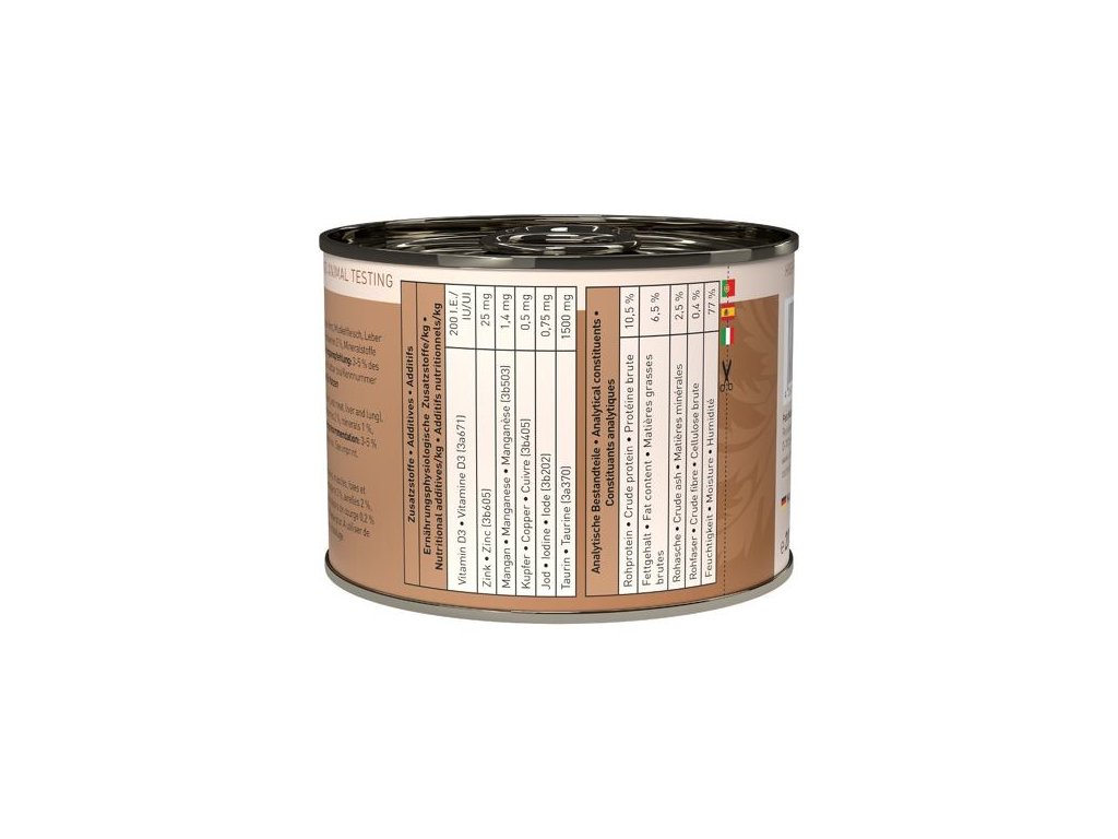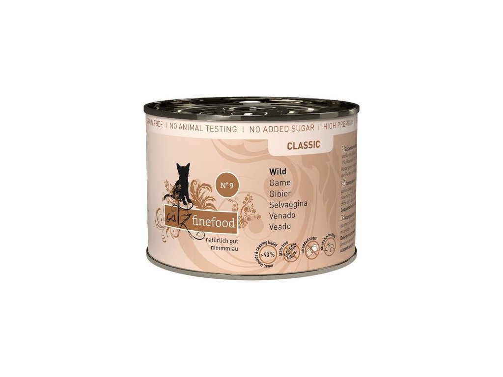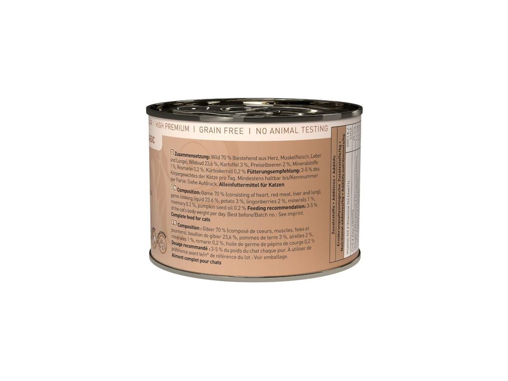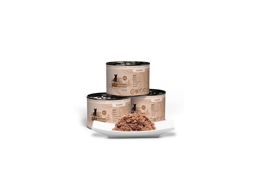 Lahodná konzerva pro kočky, která obsahuje vysoký podíl zvěřiny, zdraví prospěšné brusinky a brambory. Konzervy Catz finefood obsahují pouze suroviny vysoké potravinářské kvality a svým složením odpovídají přirozené kočičí stravě. Jsou bez konzervantů, umělých barviv a dochucovadel. Konzervy neobsahují geneticky upravené suroviny. Jedná se o kompletní krmivo.Složení: zvěřina 70% (srdce, svalovina, játra a plíce), zvěřinový vývar 23,6%, brambory 3%, brusinky 2%, minerály 1 %, rozmarýn 0,2%, dýňový olej 0,2%