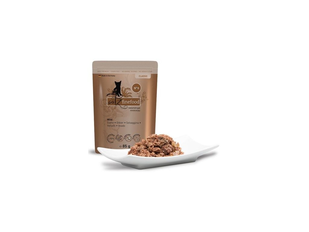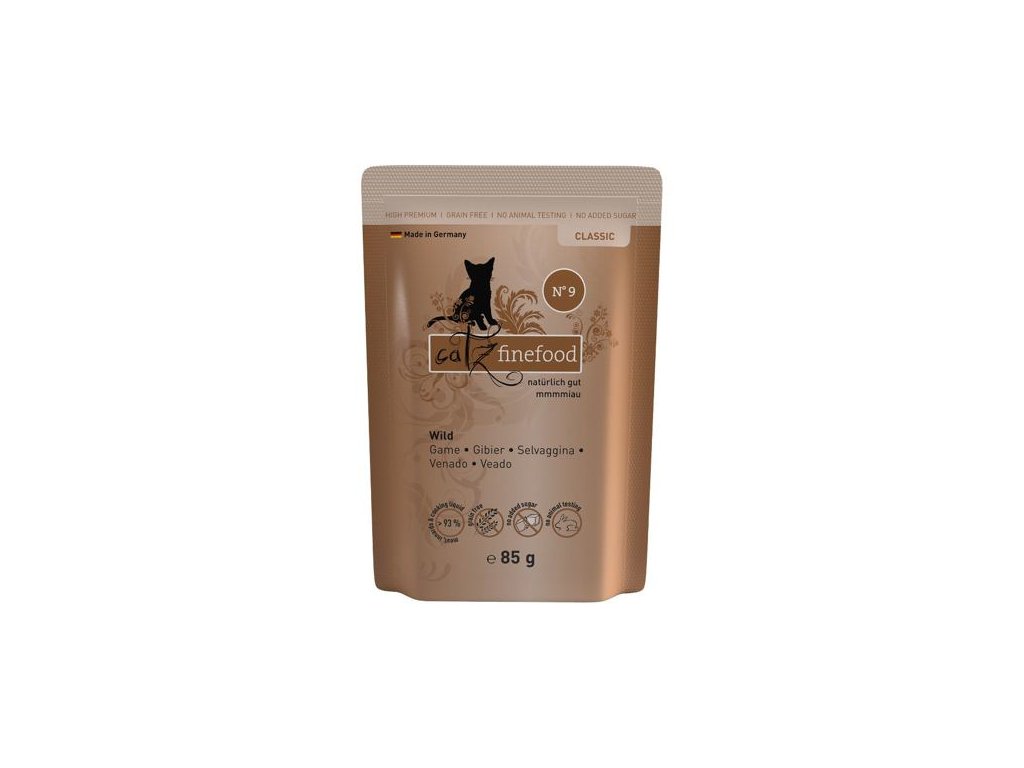 Lahodná kapsička pro kočky, která obsahuje vysoký podíl zvěřiny, zdraví prospěšné brusinky a brambory. Konzervy Catz finefood obsahují pouze suroviny vysoké potravinářské kvality a svým složením odpovídají přirozené kočičí stravě. Jsou bez konzervantů, umělých barviv a dochucovadel. Konzervy neobsahují geneticky upravené suroviny. Jedná se o kompletní krmivo.Složení: zvěřina 70% (srdce, svalovina, játra a plíce), zvěřinový vývar 23,6%, brambory 3%, brusinky 2%, minerály 1 %, rozmarýn 0,2%, dýňový olej 0,2%