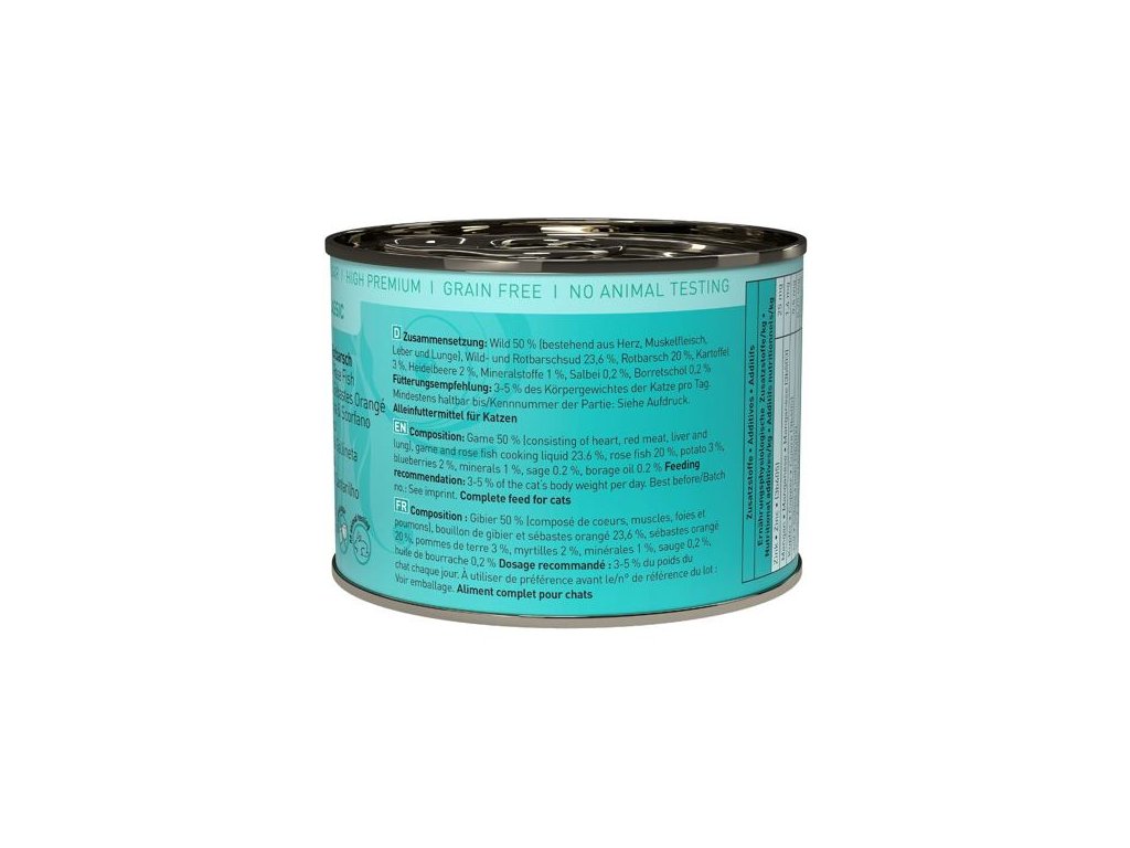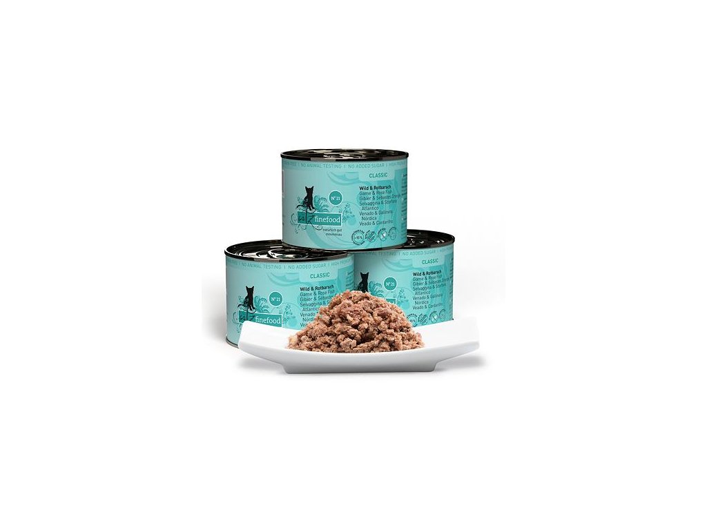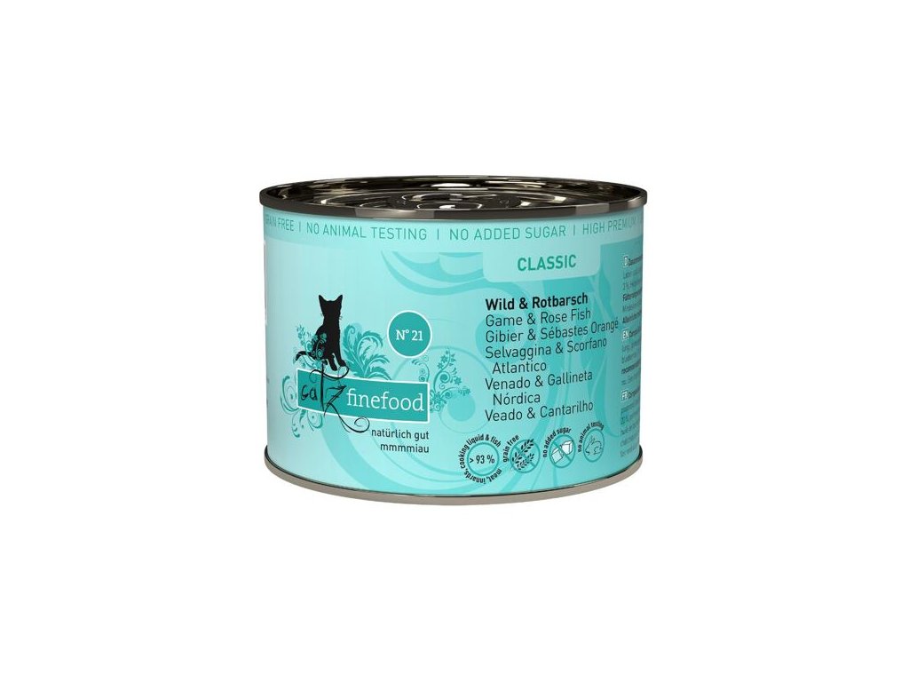 Lahodná konzerva pro kočky, která obsahuje vysoký podíl zvěřiny a rybího masa okouníka mořského, zdraví prospěšné borůvky a šalvěj. Konzervy Catz finefood obsahují pouze suroviny vysoké potravinářské kvality a svým složením odpovídají přirozené kočičí stravě. Jsou bez konzervantů, umělých barviv a dochucovadel. Konzervy neobsahují geneticky upravené suroviny. Jedná se o kompletní krmivo.Složení: zvěřina 50% (srdce, svalovina, plíce a játra), vývar ze zvěřiny a okouníka mořského 23,6%, maso okouníka mořského 20%, brambory 3%, borůvky 2%, minerální látky 1%, šalvěj 0,2%, brutnákový olej 0,2%