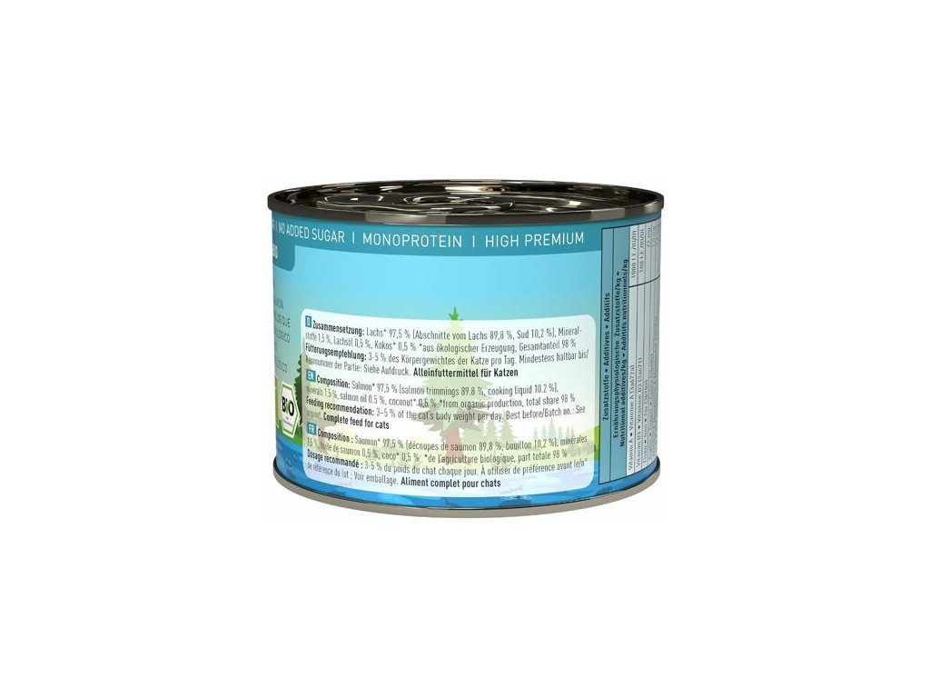 Složení: losos 97,5 % (ořez z lososa 89,8 %, vývar 10,2 %), minerální látky 1,5 %, lososový olej 0,5 %, kokos 0,5 %