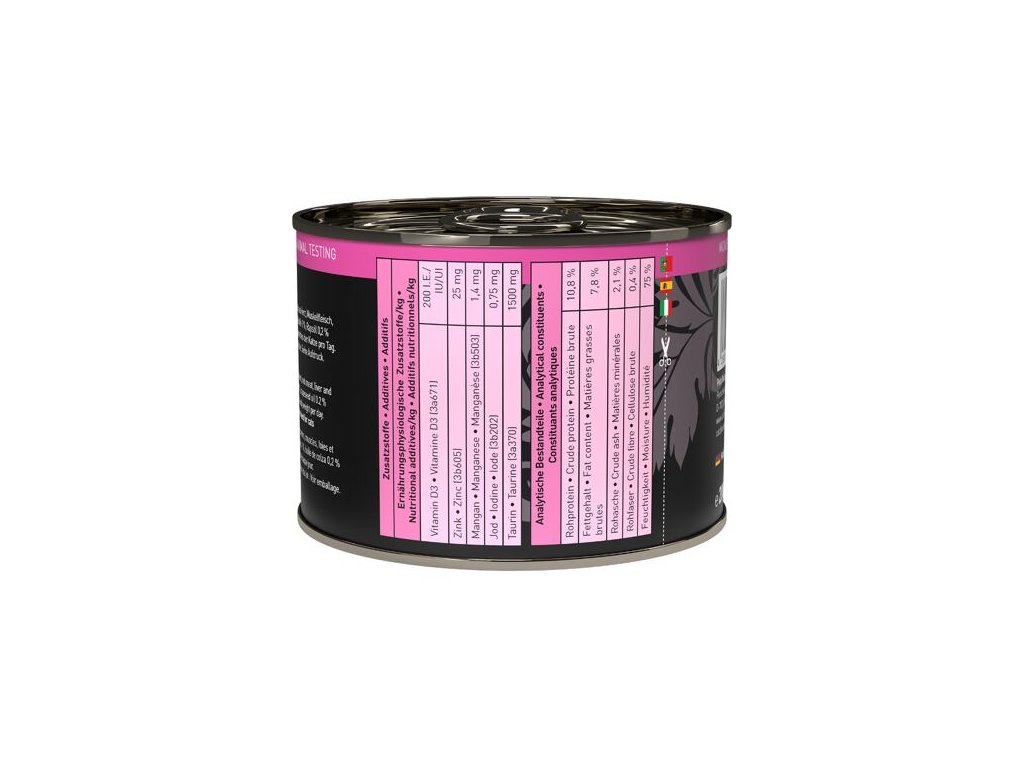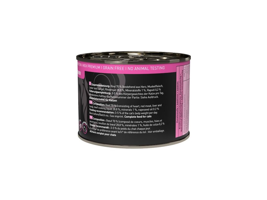 Složení: hovězí maso 70% (srdce, svalovina, játra a plíce), hovězí vývar 28,8%, minerální látky 1%, řepkový olej 0,2%