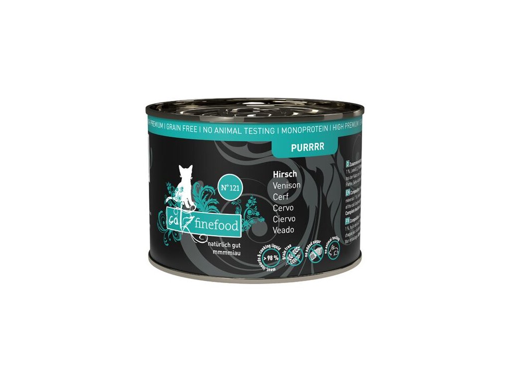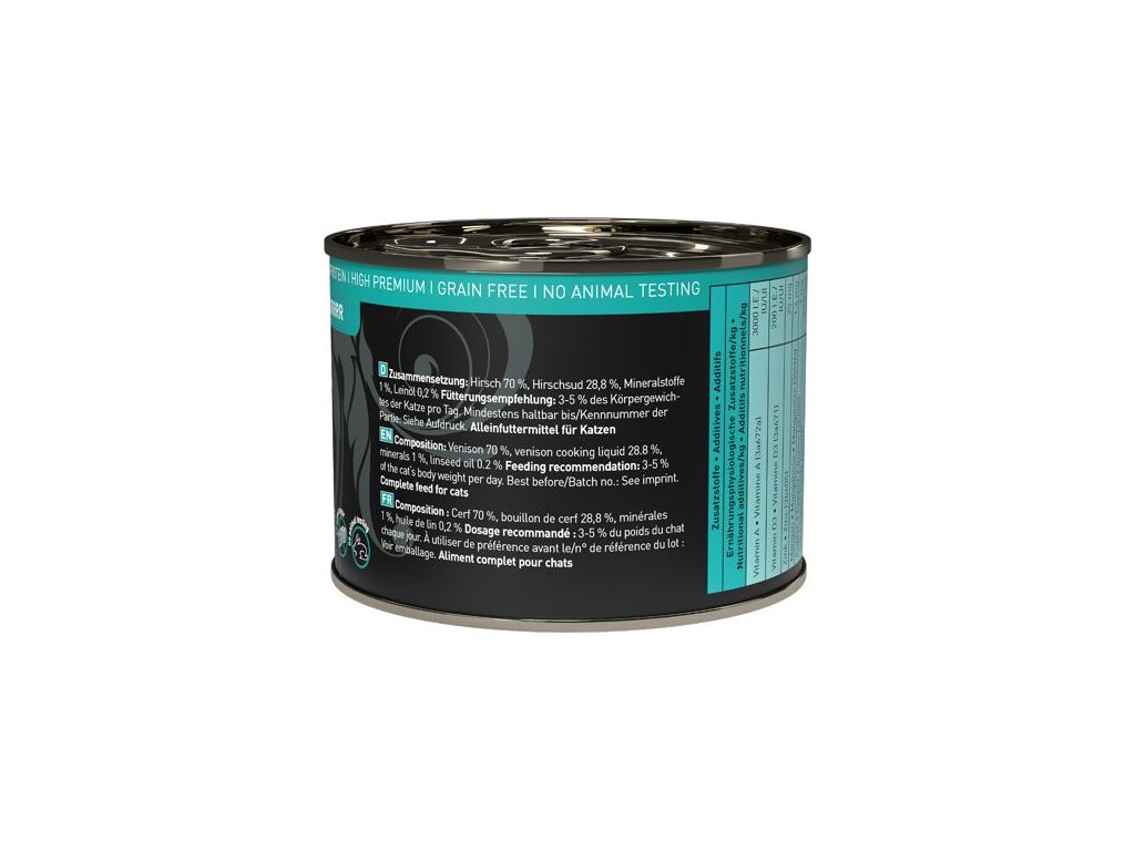 Excelentní konzerva pro kočky, která obsahuje pouze jelení maso, jelení vývar, minerální látky a lněný olej. Je proto vhodná i pro kočky s citlivým zažíváním nebo alergiky. Jedná se o kompletní monoproteinové krmivo pro kočky všech věkových kategorií a plemen.Stejně jako všechna krmiva Petsnature, tato konzerva neobsahuje geneticky upravené suroviny, je bez konzervantů, umělých barviv a dochucovadel a všechny použité suroviny svým složením odpovídají přirozené kočičí stravě.