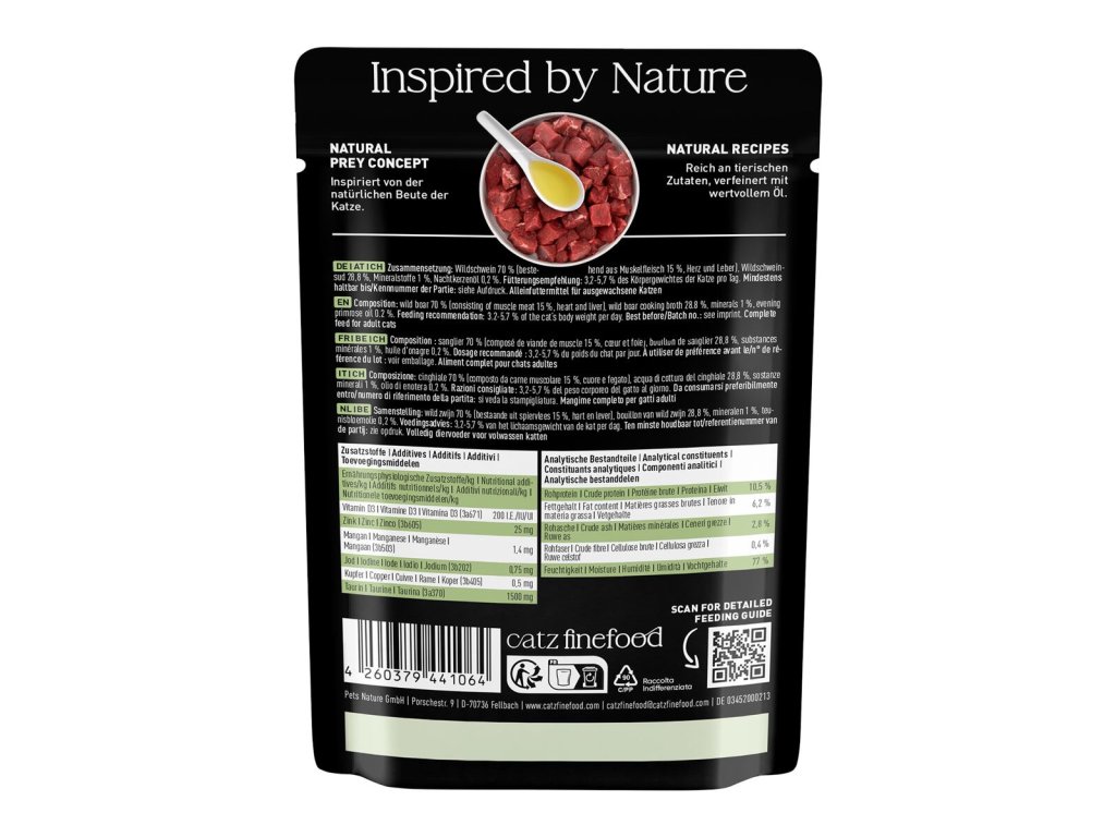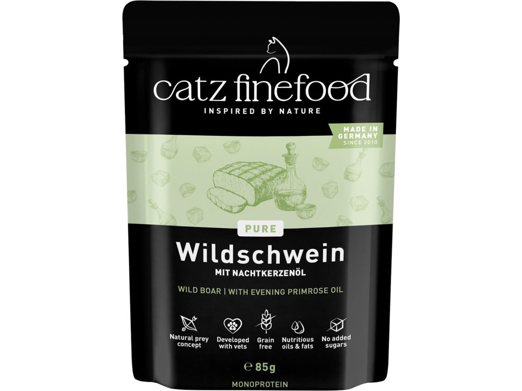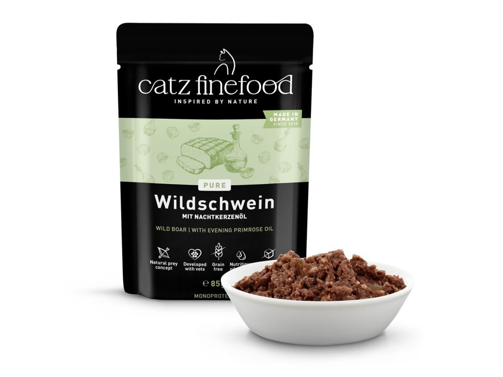 Monoproteinové kompletní krmivo pro kočky, které obsahuje pouze kančí maso, vývar, minerální látky a pupalkový olej. Vhodné i pro kočky s citlivým zažíváním nebo pro alergické kočky.Suroviny jsou vysoké potravinářské kvality a svým složením odpovídají přirozené kočičí stravě. Jsou bez konzervantů, umělých barviv a dochucovadel. Neobsahuje ani geneticky upravené suroviny.