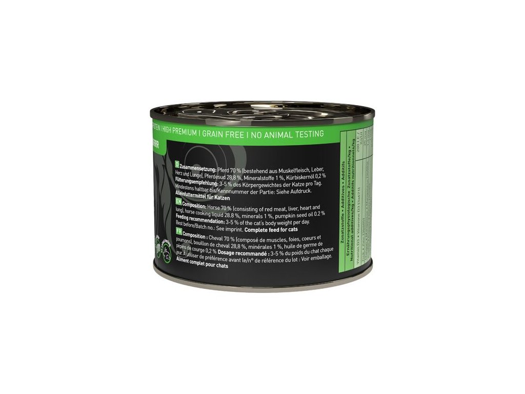 Excelentní konzerva pro kočky, která obsahuje pouze koňské maso, vnitřnosti a vývar, minerální látky a dýňový olej. Je proto vhodná i pro kočky s citlivým zažíváním nebo alergiky. Jedná se o kompletní monoproteinové krmivo pro kočky všech věkových kategorií a plemen.Stejně jako všechna krmiva Petsnature, tato konzerva neobsahuje geneticky upravené suroviny, je bez konzervantů, umělých barviv a dochucovadel a všechny použité suroviny svým složením odpovídají přirozené kočičí stravě.