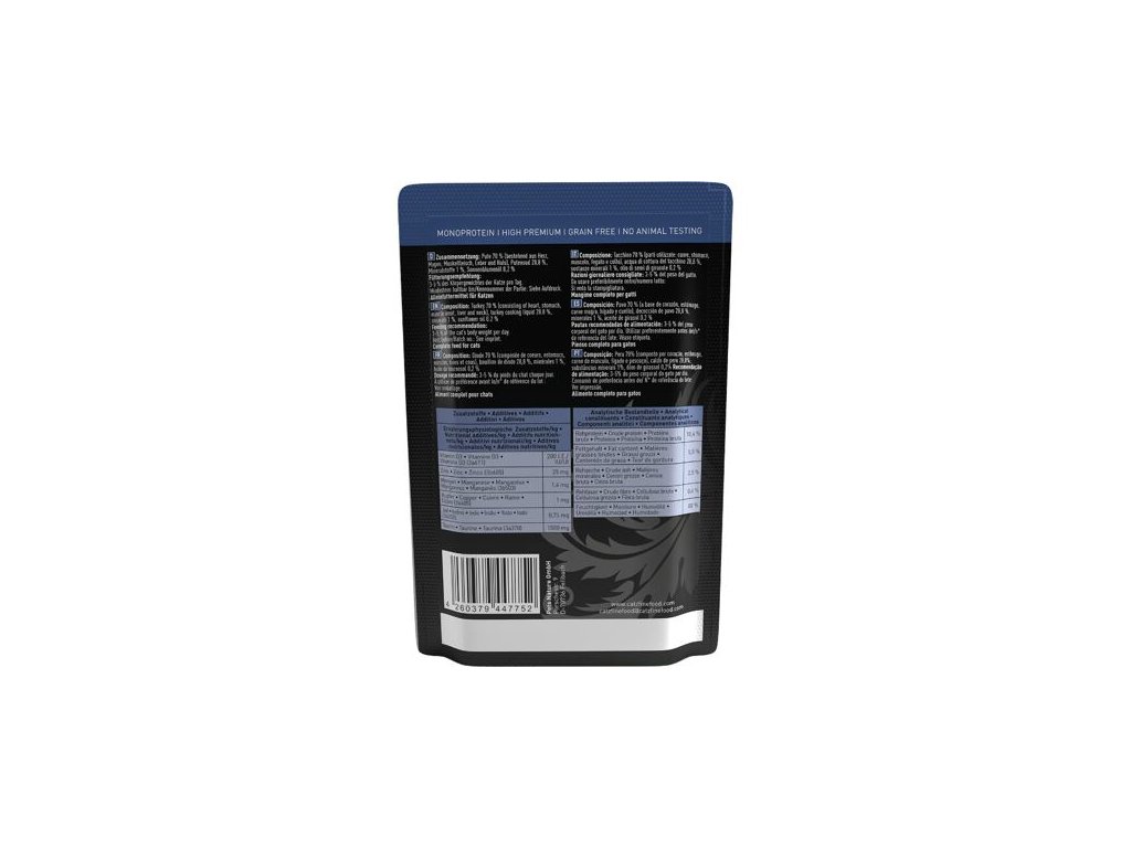 Excelentní kapsička pro kočky, která obsahuje pouze krůtí maso a vnitřnosti, krůtí vývar, minerální látky a slunečnicový olej. Je proto vhodná i pro kočky s citlivým zažíváním nebo alergiky. Jedná se o kompletní monoproteinové krmivo pro kočky všech věkových kategorií a plemen.Stejně jako všechna krmiva Petsnature, tato kapsička neobsahuje geneticky upravené suroviny, je bez konzervantů, umělých barviv a dochucovadel a všechny použité suroviny svým složením odpovídají přirozené kočičí stravě.