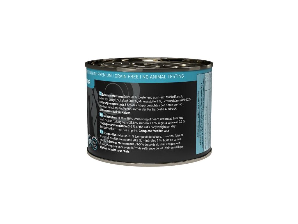 Lahodná konzerva pro kočky, která obsahuje pouze skopové maso, vývar, minerální látky a olej z černuchy seté (černý kmín). Konzerva je tak vhodná i pro kočky s citlivým zažíváním nebo pro alergické kočky. Jedná se o kompletní krmivo.Suroviny jsou vysoké potravinářské kvality a svým složením odpovídají přirozené kočičí stravě. Jsou bez konzervantů, umělých barviv a dochucovadel. Konzervy neobsahují geneticky upravené suroviny.