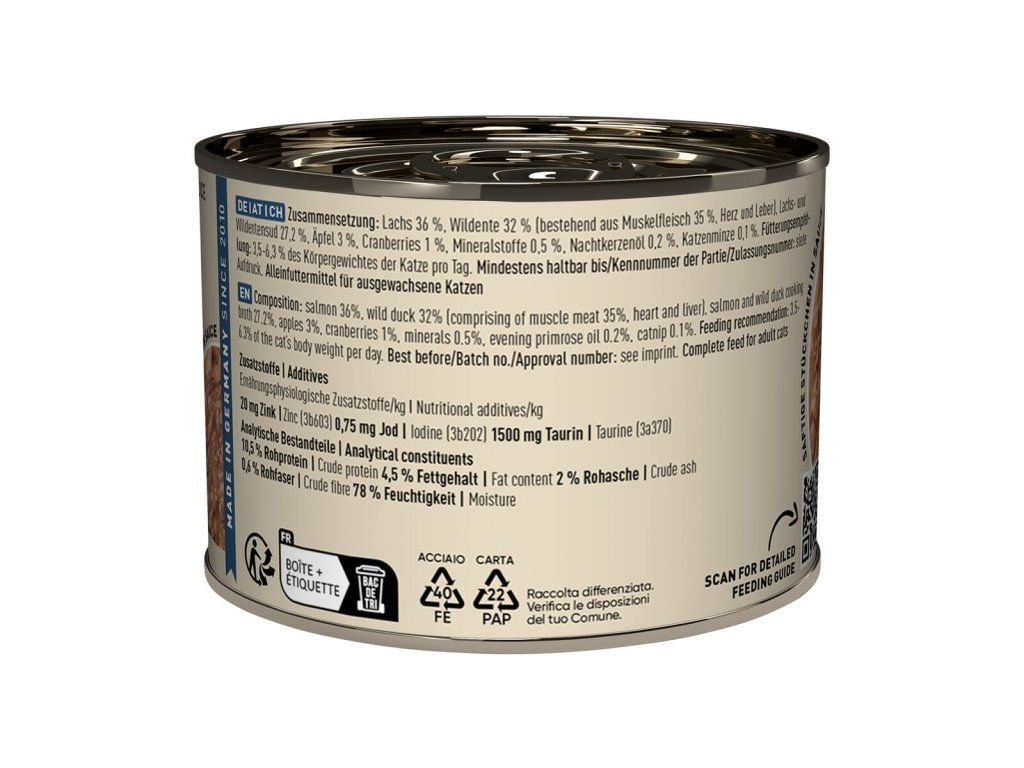 Složení: losos 36 %, divoká kachna 32 % (z toho svalovina 35 %, srdce a játra), vývar z lososa a kachny 27,2 %, jablka 3 %, brusinky 1 %, minerální látky 0,5 %, pupalkový olej 0,2 %, šanta kočičí 0,1 %