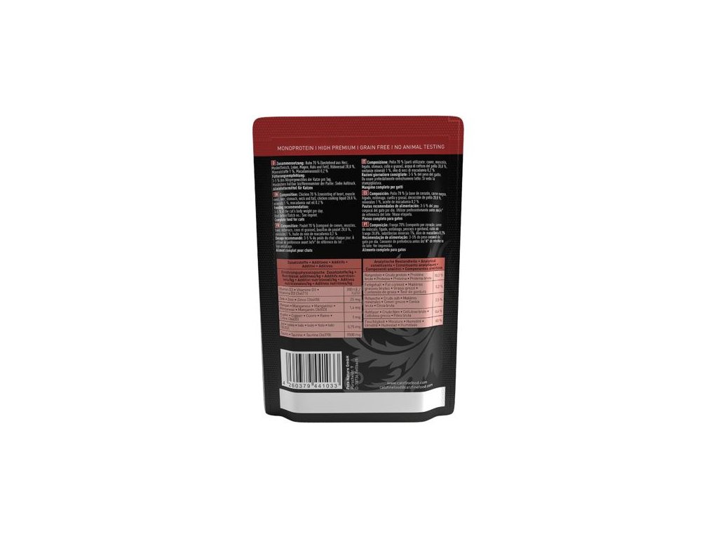 Lahodná kapsička pro kočky, která obsahuje pouze kuřecí maso, vnitřnosti, vývar, minerální látky a makadamový olej. Konzerva je vhodná i pro kočky s citlivým zažíváním nebo pro alergické kočky. Jedná se o kompletní krmivo.Suroviny jsou vysoké potravinářské kvality a svým složením odpovídají přirozené kočičí stravě. Jsou bez konzervantů, umělých barviv a dochucovadel. Konzervy neobsahují geneticky upravené suroviny.