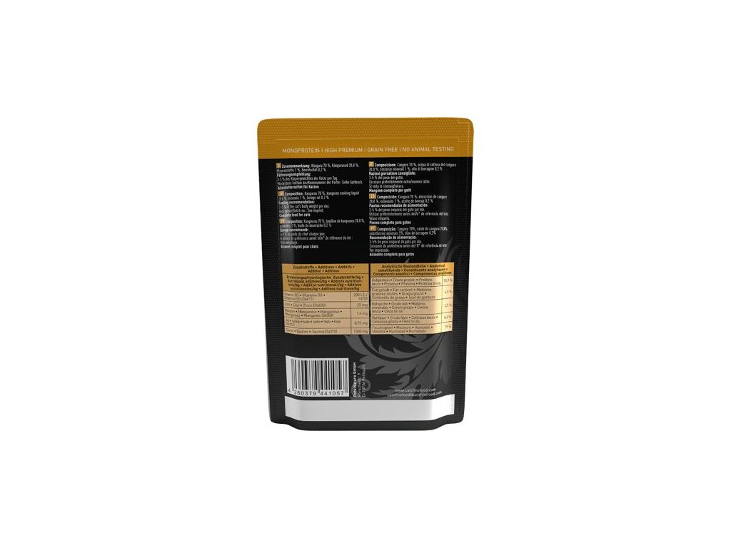Lahodná kapsička pro kočky, která obsahuje pouze klokaní maso, vývar, minerální látky a olej z brutnáku lékařského. Konzerva je tak vhodná i pro kočky s citlivým zažíváním nebo pro alergické kočky. Jedná se o kompletní krmivo.Suroviny jsou vysoké potravinářské kvality a svým složením odpovídají přirozené kočičí stravě. Jsou bez konzervantů, umělých barviv a dochucovadel. Konzervy neobsahují geneticky upravené suroviny.