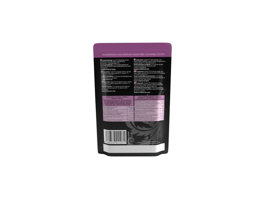 Lahodná konzerva pro kočky, která obsahuje pouze jehněčí maso, vývar, minerální látky a pupalkový olej. Konzerva je tak vhodná i pro kočky s citlivým zažíváním nebo pro alergické kočky. Jedná se o kompletní krmivo.Suroviny jsou vysoké potravinářské kvality a svým složením odpovídají přirozené kočičí stravě. Jsou bez konzervantů, umělých barviv a dochucovadel. Konzervy neobsahují geneticky upravené suroviny.