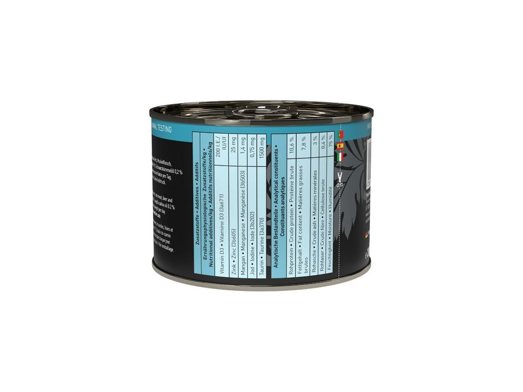 Lahodná konzerva pro kočky, která obsahuje pouze skopové maso, vývar, minerální látky a olej z černuchy seté (černý kmín). Konzerva je tak vhodná i pro kočky s citlivým zažíváním nebo pro alergické kočky. Jedná se o kompletní krmivo.Suroviny jsou vysoké potravinářské kvality a svým složením odpovídají přirozené kočičí stravě. Jsou bez konzervantů, umělých barviv a dochucovadel. Konzervy neobsahují geneticky upravené suroviny.