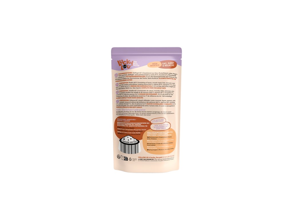 Složení: drůbeží maso 60 % (srdce, svalovina, játra, žaludek, krk, tuk), vývar z drůbeže a lososa 26,8 %, losos 10 %, cuketa 2 %, minerální látky 1 %, lososový olej 0,2 %