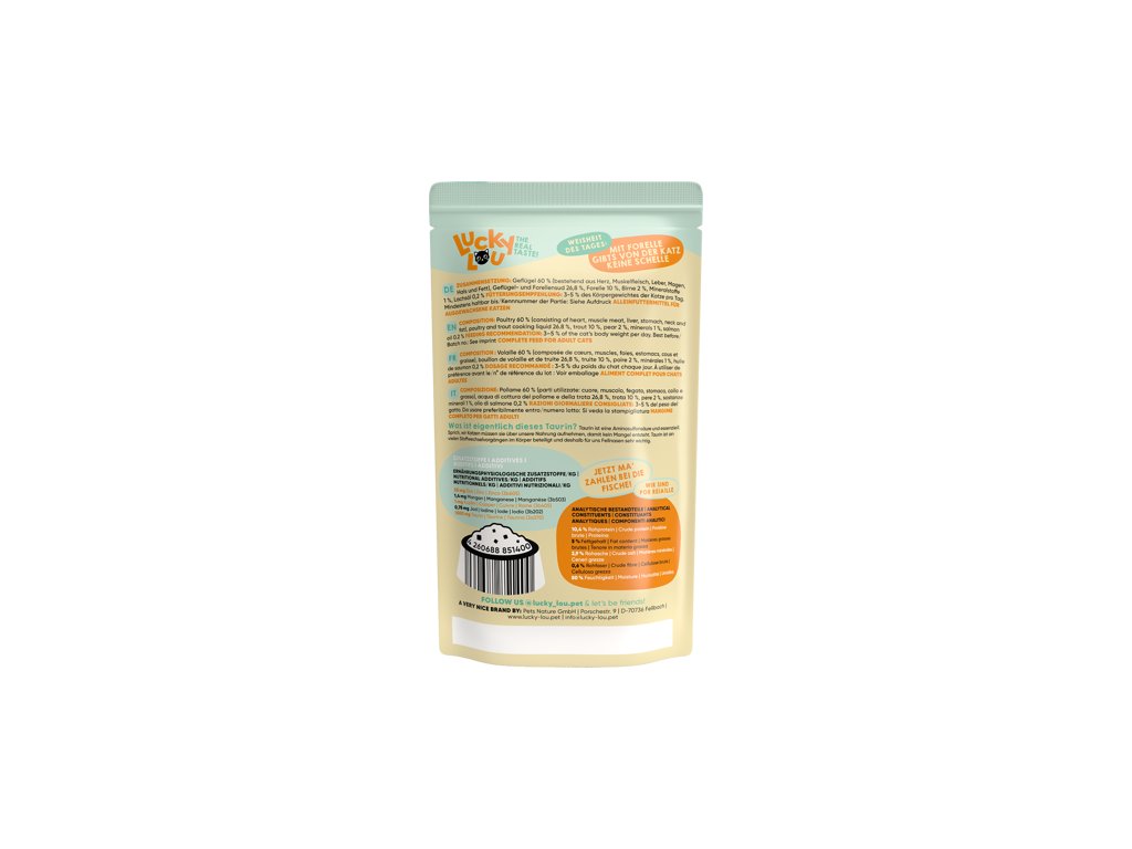 Složení: drůbeží maso 60 % (srdce, svalovina, játra, žaludek, krk, tuk), vývar z drůbežího masa a pstruha 26,8 %, pstruh 10 %, hruška 2 %, minerální látky 1 %, lososový olej 0,2 %