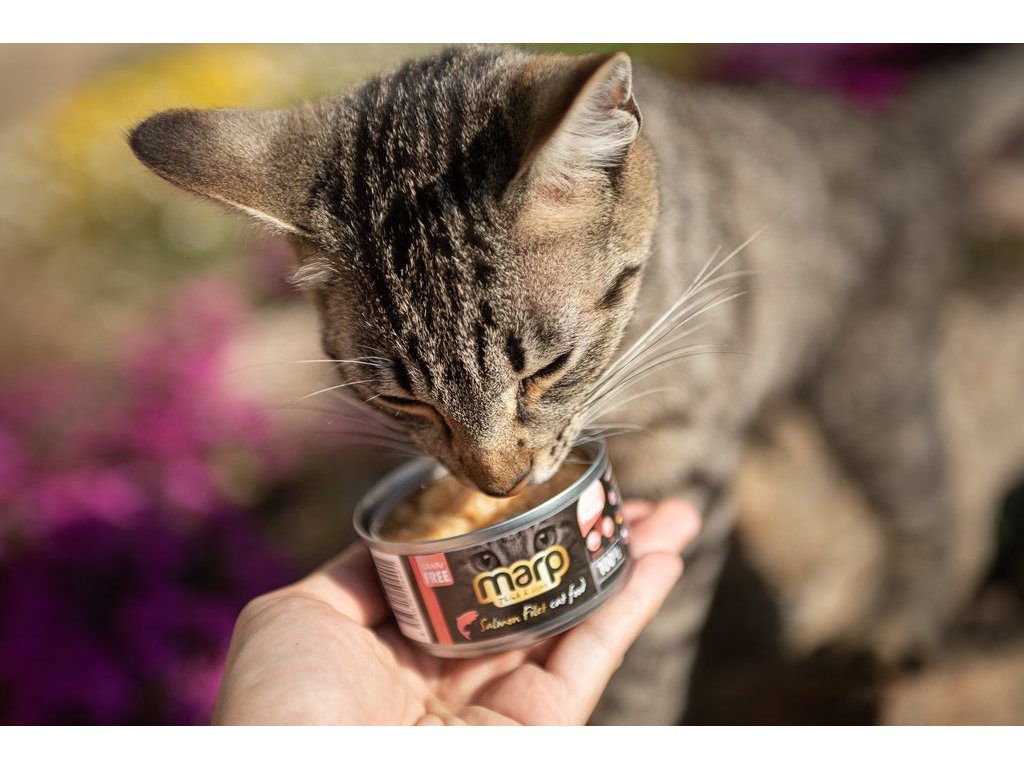 Víme, že kočka je masožravec a proto ji jako takovou ctíme. Konzervy Marp obsahují 100% bílkovin ze živočišných zdrojů. Tato nejvyšší řada konzerv Marp obsahuje pouze čistou svalovinu - kousky masa z lososa. Oproti většině podobných produktů na trhu, které pocházejí z Asie, vyrábíme tyto konzervy v Německu.