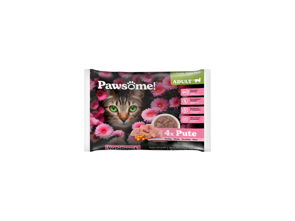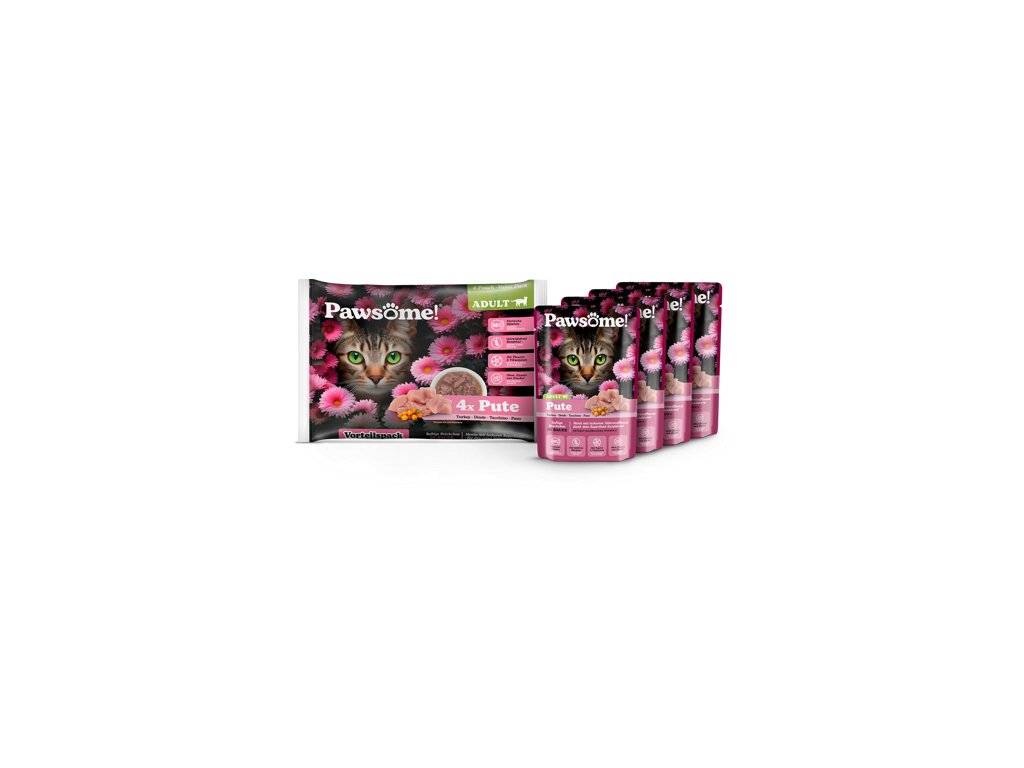 Šťavnaté kousky s krůtím masem, lněným olejem a rakytníkem v lahodné omáčce jsou kompletním krmivem s vyváženým podílem bílkovin, tuků, vitamínů a minerálů, které přispívají ke spokojenému a aktivnímu životu dospělých koček všech plemen a velikostí.Krmivo Pawsome! je vytvořeno tak, aby splňovalo očekávání i těch nejmlsnějších mazlíčků a zároveň zajišťovalo jejich zdraví, vitalitu a celkovou spokojenost.