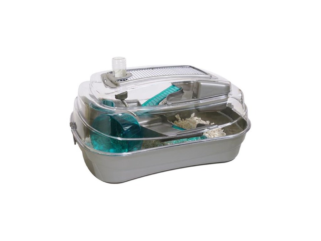 Plně zařízený komfortní celoplastový box Adobe poskytuje křečíkům a myškám zábavný životní prostor v celé výšce boxu díky několika propojeným patrům.
