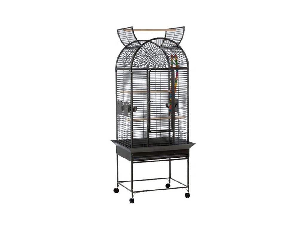 Voliéra Anna pro papoušky v hnědé barvě vhodná pro středně velké a větší papoušky. Klec se dodává se stojanem a je vybavená kolečky, čímž je umožněna pojízdnost klece a spodními ochrannými bočními lištami proti znečišťování okolí klece. Strop klece je půlkopulovitý a otevíratelný a po vložení bidýlka jej lze použít jako posed pro papouška. Spodní část klece je vysunovací pro jednodušší a pohodlnější čištění.
