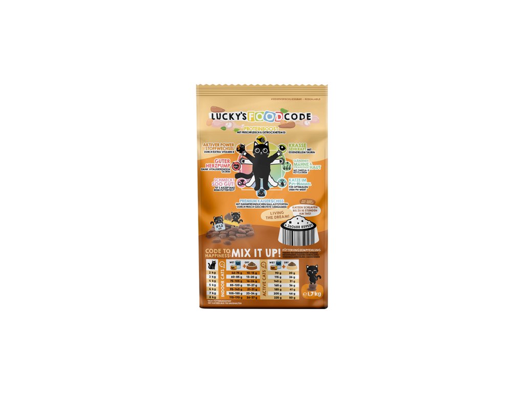 Krmivo Lucky Lou Food Code je inspirováno konceptem Vitruviánského muže od Leonarda da Vinciho a jedinečným způsobem tak kombinuje 8 výhod pro holistický koncept zdraví. Odráží tím da Vinciho pohled na dokonalé proporce těla, jeho krásu, zdraví a dokonalost do kočičího světa.