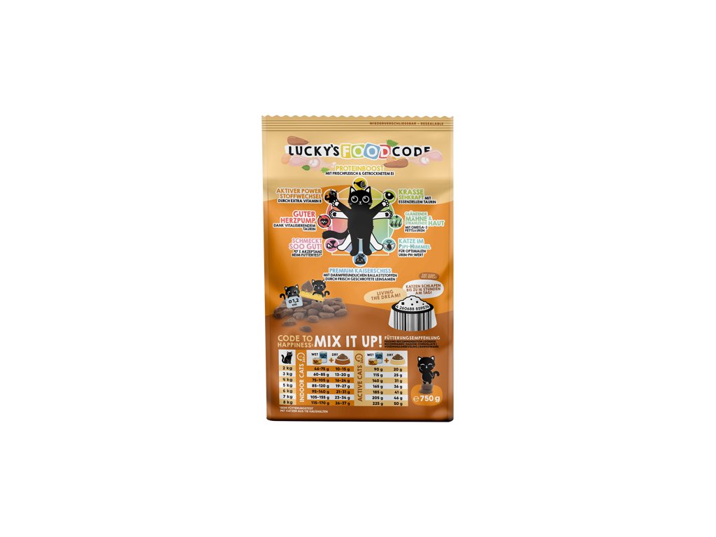 Krmivo Lucky Lou Food Code je inspirováno konceptem Vitruviánského muže od Leonarda da Vinciho a jedinečným způsobem tak kombinuje 8 výhod pro holistický koncept zdraví. Odráží tím da Vinciho pohled na dokonalé proporce těla, jeho krásu, zdraví a dokonalost do kočičího světa.